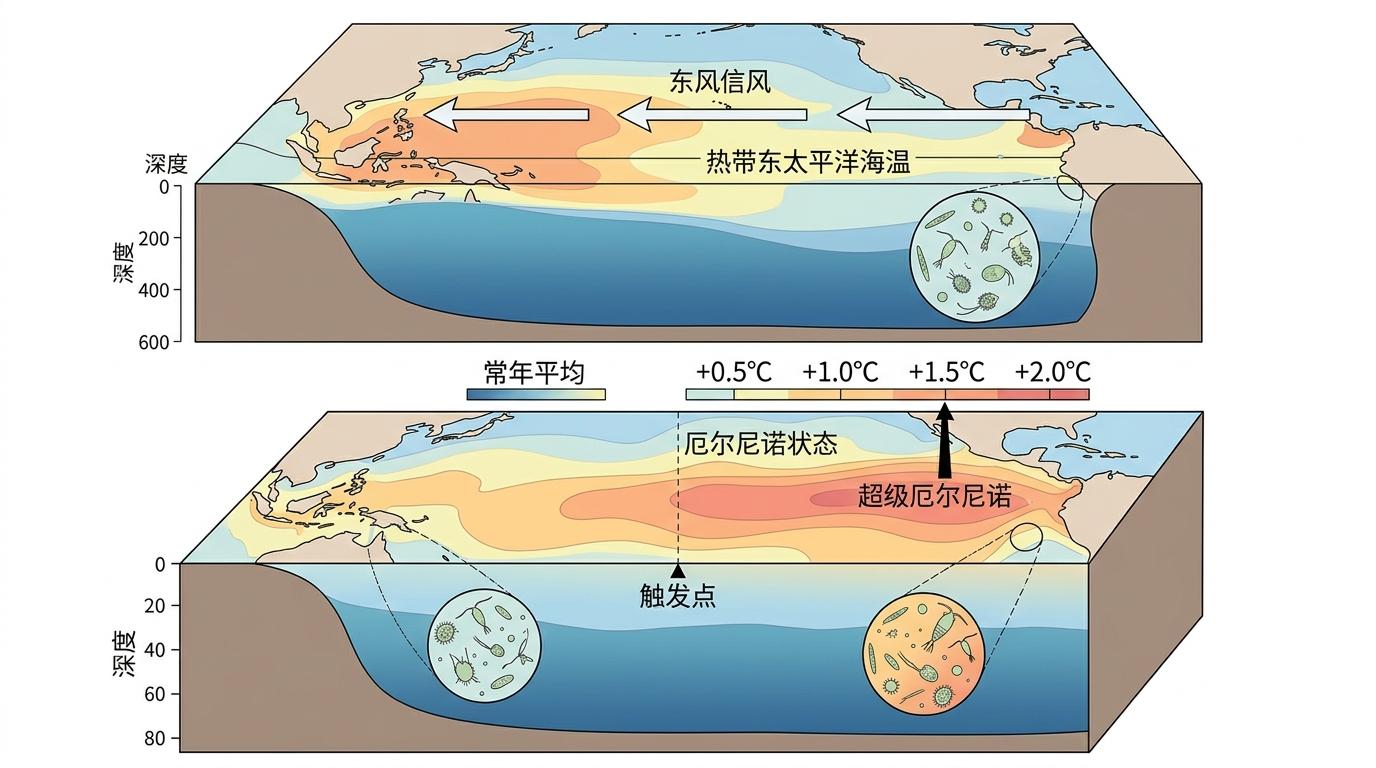 你可以把厄尔尼诺想象成太平洋按下了“气候重置键”——原本固定的东风信风突然减弱,热带东太平洋的海水像被松开的热水袋,温度比常年高出0.5℃以上,就正式触发了这场“天气狂欢”。如果海温飙升2℃以上,那就是连官方都没有明确定义、却让所有气象学家紧张的“超级厄尔尼诺”。