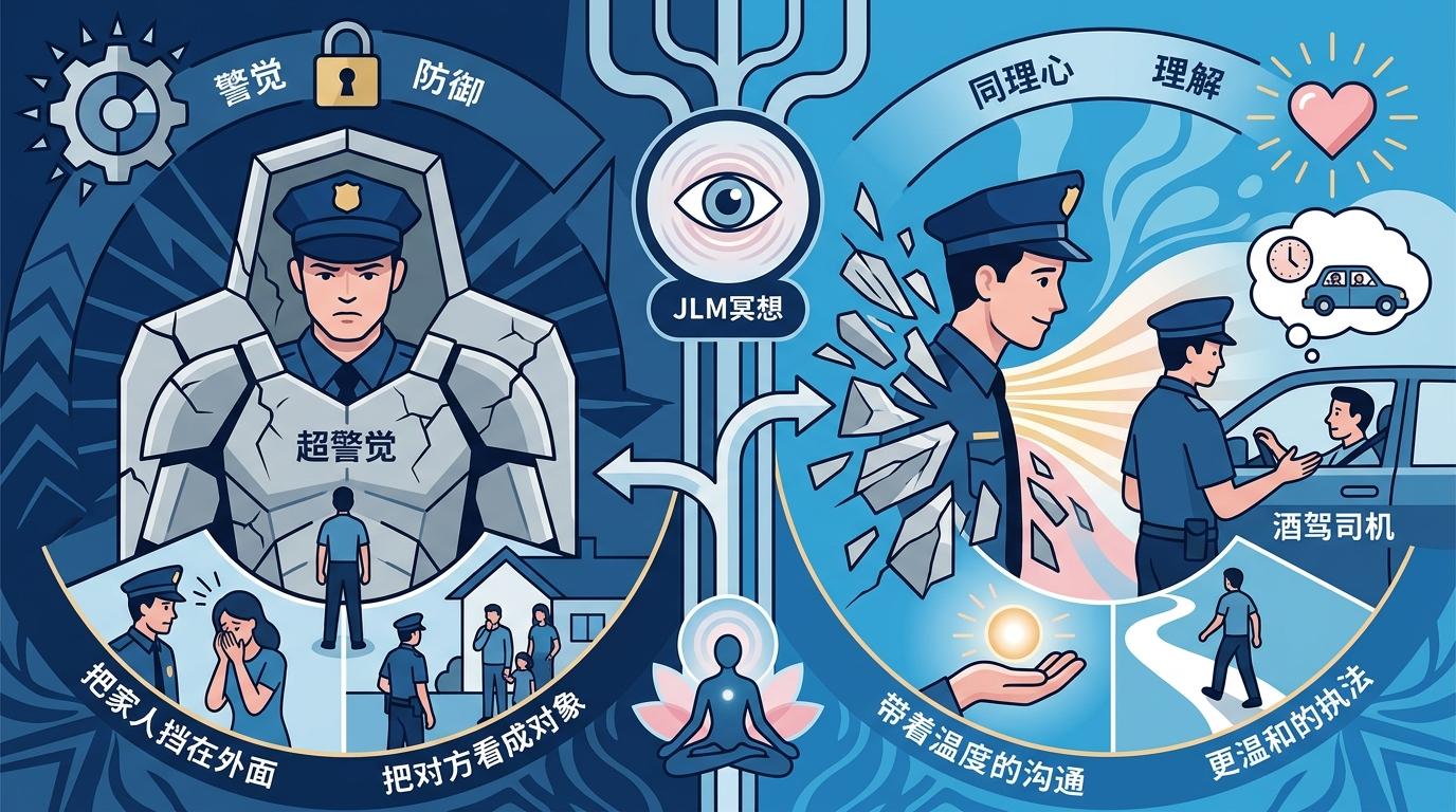 对警务人员来说,这种练习的意义远不止于“拉近距离”。他们的职业要求时刻保持高度警觉,这种“超警觉”状态像一层坚硬的壳,能在街头保护他们,却也会在回家时把家人挡在外面,在执法时把对方看成“需要处理的对象”。JLM冥想就是要在这层壳上敲出一道缝:当你盯着一个酒驾司机的眼睛,默念“和我一样,他也有过赶时间送孩子的慌张”,你做出的可能就不是一个机械的处罚决定,而是一次带着温度的沟通。