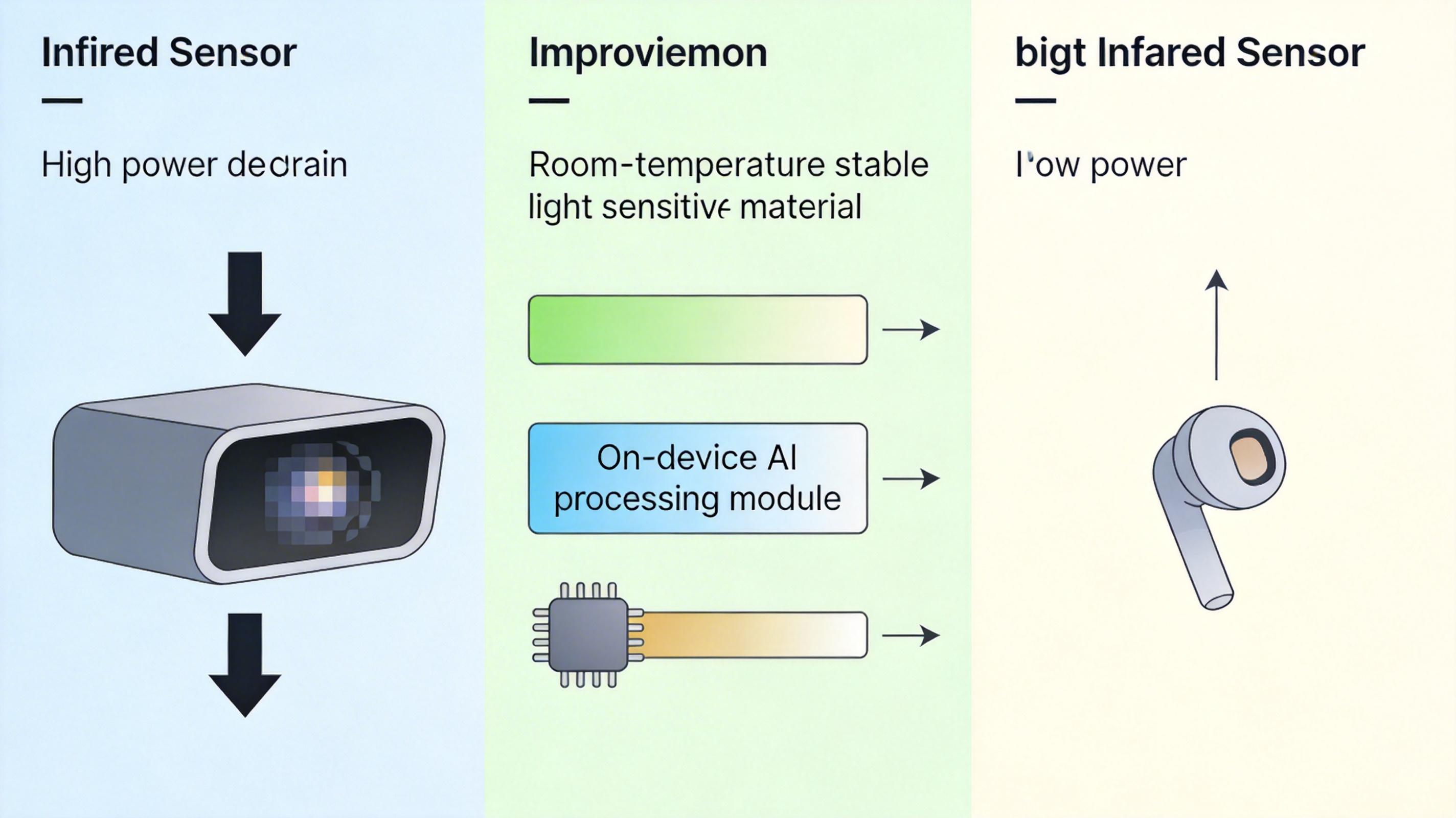 把这套系统塞进耳机这类小设备,最大的挑战从来不是「能不能看见」,而是「能不能在小空间里低成本、低功耗地看见」。传统红外传感器要么体积大、功耗高,要么分辨率低到只能识别模糊轮廓。现在的突破来自三个方向:新型感光材料让传感器能在室温下稳定工作,不用额外制冷;轻量级AI算法能在设备本地实时处理热信号,不用依赖云端;芯片集成技术把传感器、处理器和电池压缩到几立方厘米的空间里。