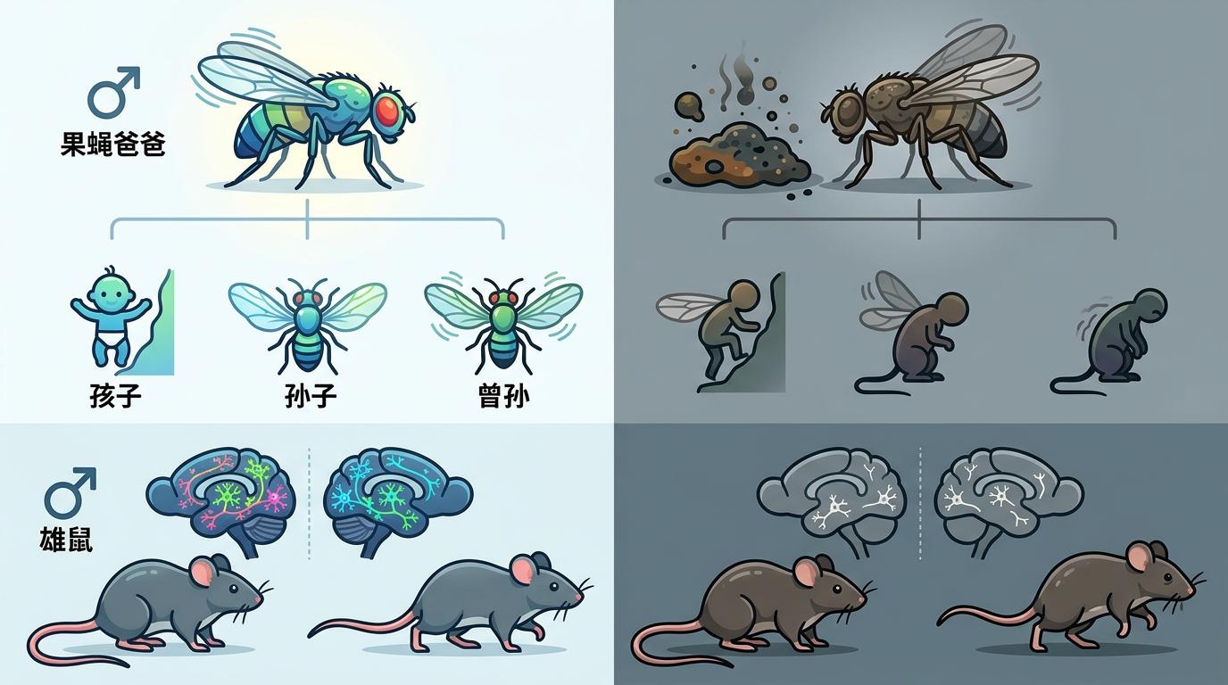 研究人员先给果蝇爸爸喂了含重金属的食物,结果发现它的孩子、孙子,甚至曾孙,都出现了明显的运动障碍——爬试管的速度越来越慢,翅膀振动的力度也越来越弱。换成小鼠做实验,结论一模一样:喝了三个月重金属水的雄鼠,它的后代不仅走路不稳,大脑里负责运动控制的多巴胺能神经元,竟然悄悄变少了。