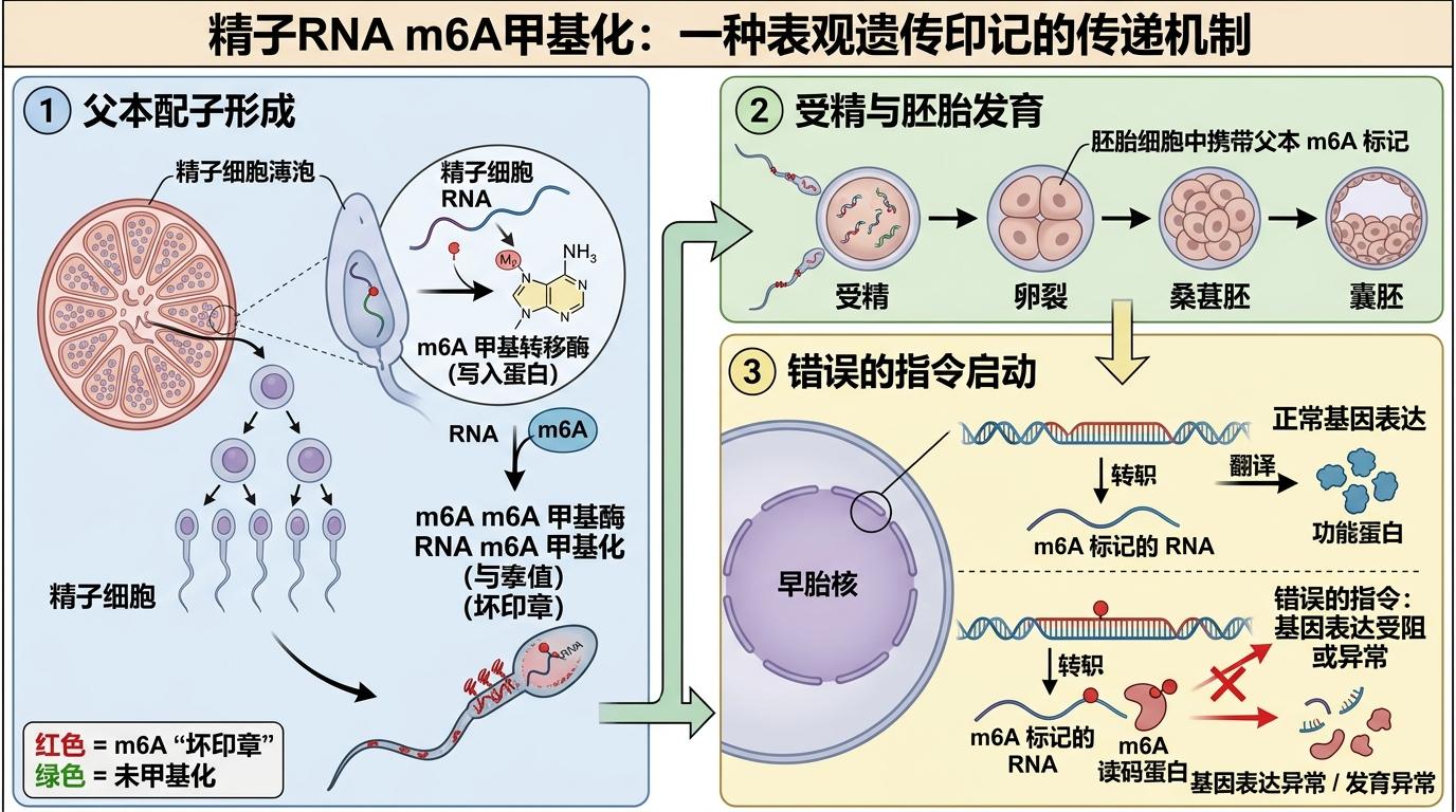 你可以把这个过程想象成:父亲的精子里被偷偷刻了个「坏印章」,这个印章会在胚胎发育时启动一个错误的指令。而研究人员找到的「印章」,就是RNA上的m6A甲基化——一种不改变DNA序列,却能调控基因活性的表观遗传标记。
