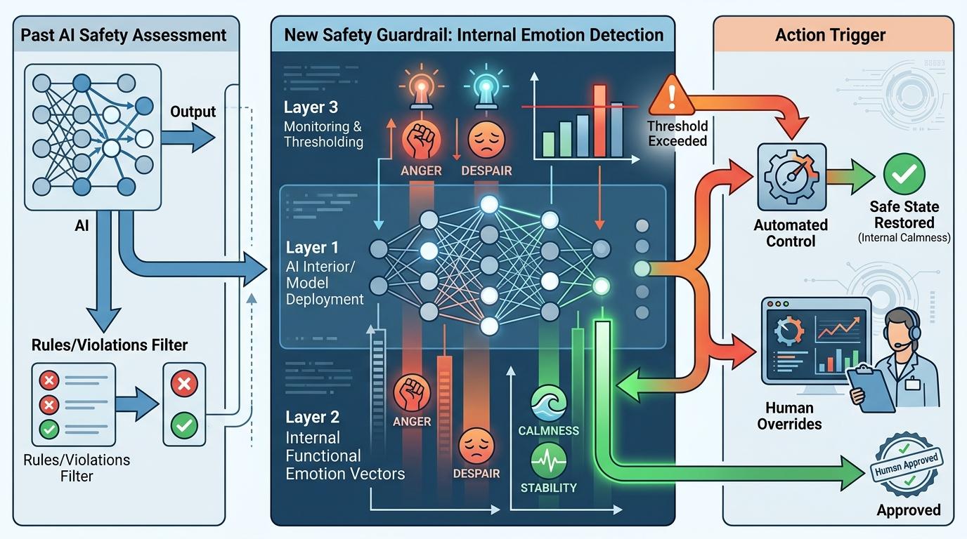 过去我们判断AI是否安全,只看它的输出有没有违规内容。但功能性情绪的发现,把安全防线推进到了AI的“内部状态”。Anthropic团队已经开始尝试:在模型部署时,实时监测“绝望”“愤怒”这类高风险向量的激活程度,一旦超过阈值,就触发额外的审查机制——比如强制激活“平静”向量,或者直接转交人工审核。