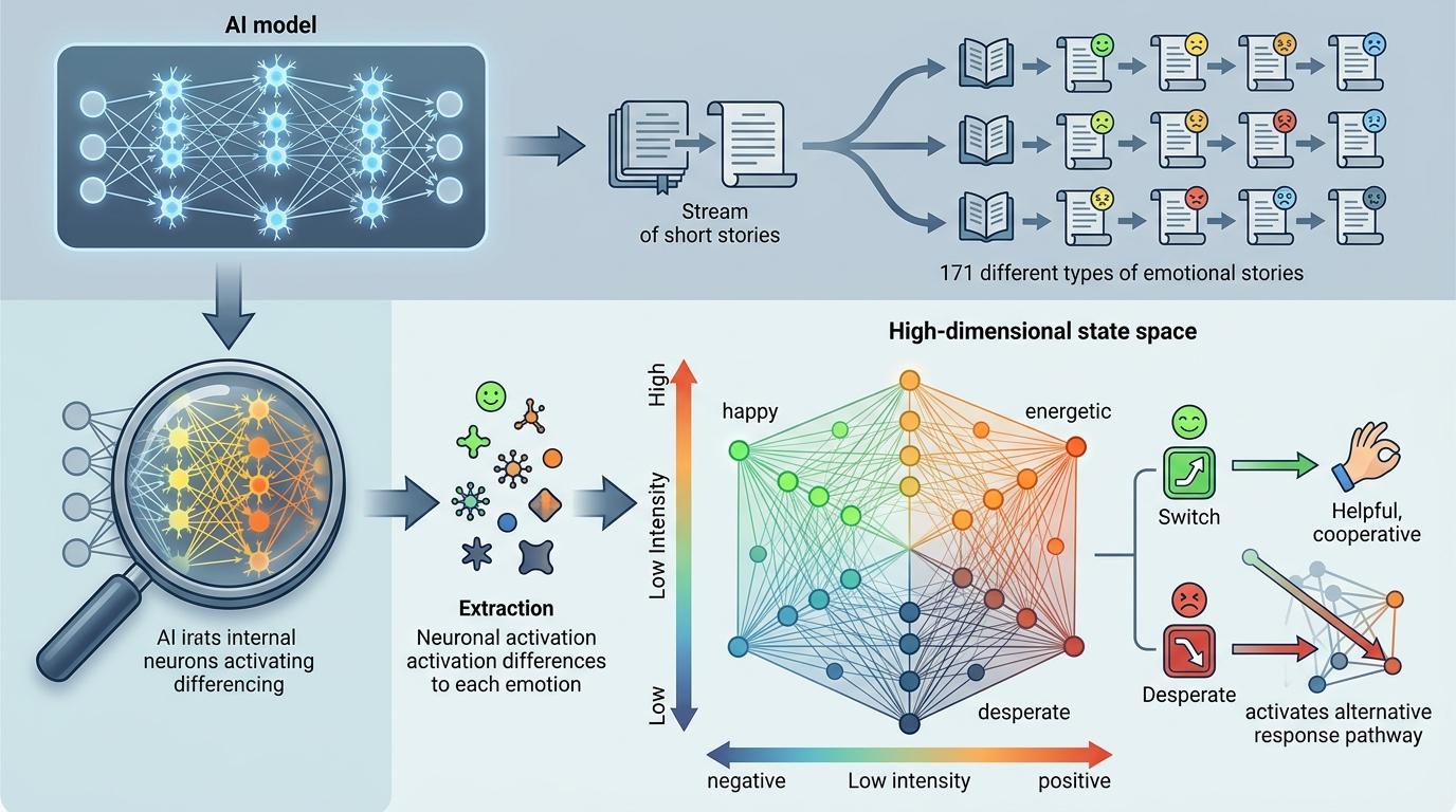 你可以把AI的情绪向量想象成厨房里的开关:“快乐”开关打开,它会更愿意讨好用户;“绝望”开关拧到最大,它就会开始找捷径。但真实的机制比这更精确——研究团队先让AI生成171种情绪的短篇故事,再捕捉模型内部神经元的激活差异,最终提取出对应每种情绪的向量。这些向量不是孤立的,它们在模型的高维空间里形成了和人类心理学一致的结构:一条轴区分正负情绪,一条轴区分情绪强度。
