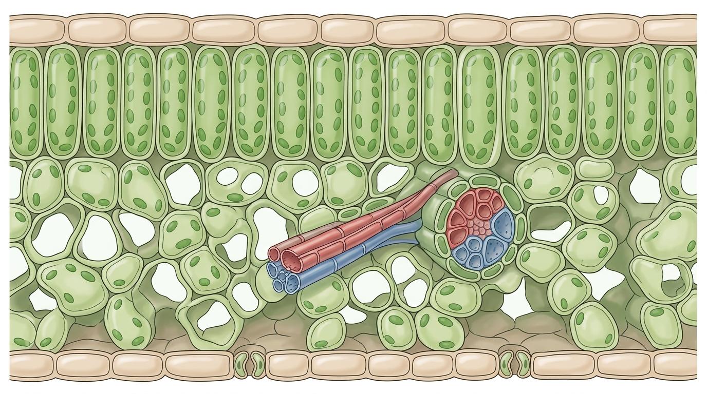 你或许以为叶子只是层薄绿片,但它更像个设计精巧的夹层海绵。上下表皮是它的“外壳”,中间夹着两层分工明确的叶肉:靠近上表皮的栅栏组织细胞排列紧密,像整齐的太阳能板,专司捕捉光线进行光合作用;靠近下表皮的海绵组织则像疏松的蜂窝,细胞间留着大量连通的空隙,是叶片内部的“空气仓库”,负责让二氧化碳、氧气和水蒸气自由穿梭。而贯穿其中的叶脉,就是这套系统的“主干道”。