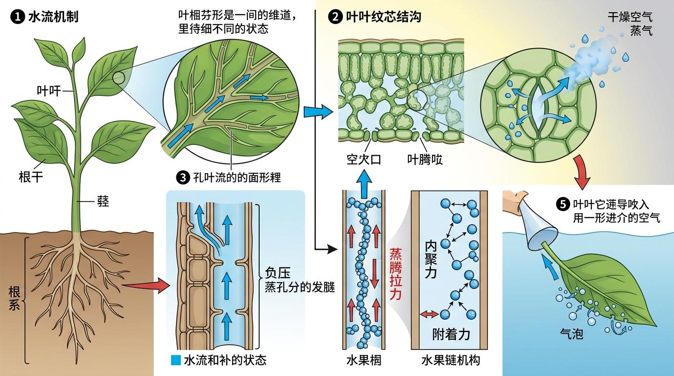 叶脉里藏着植物的“输水管道”——木质部。这些由死细胞构成的细长导管,像一根根无缝的细管,从根部一直连到叶片最细微的角落。植物没有心脏,却能把水从地下几十米抽到百米高的树冠,靠的全是蒸腾作用制造的“拉力”:叶片表面的气孔不断蒸发水分,在导管里形成负压,水分子靠彼此间的内聚力和对管壁的附着力,像一串被拉紧的珠子,被持续向上拉动。当你对着叶柄吹气,空气正是顺着这套低阻力的管道钻进叶肉间隙,再从气孔逃出来变成气泡。