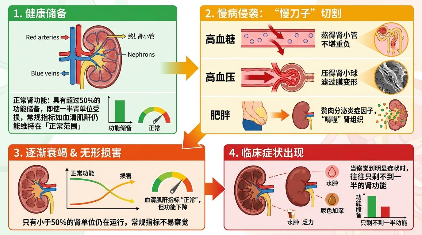 这得从肾脏的「隐忍本性」说起。它就像个默默扛活的老管家,自带超50%的功能储备——哪怕一半肾单位已经受损,血清肌酐这类常规指标还能维持在「正常范围」。等你终于察觉到水肿、乏力、尿色加深时,往往只剩不到一半的肾功能还在运转。更糟的是,糖尿病、高血压、肥胖这些高发慢病,会像慢刀子一样切割肾单位:高血糖熬得肾小管不堪重负,高血压压得肾小球滤过膜变形,连肚子上的赘肉都会分泌炎症因子,一点点啃噬肾组织。