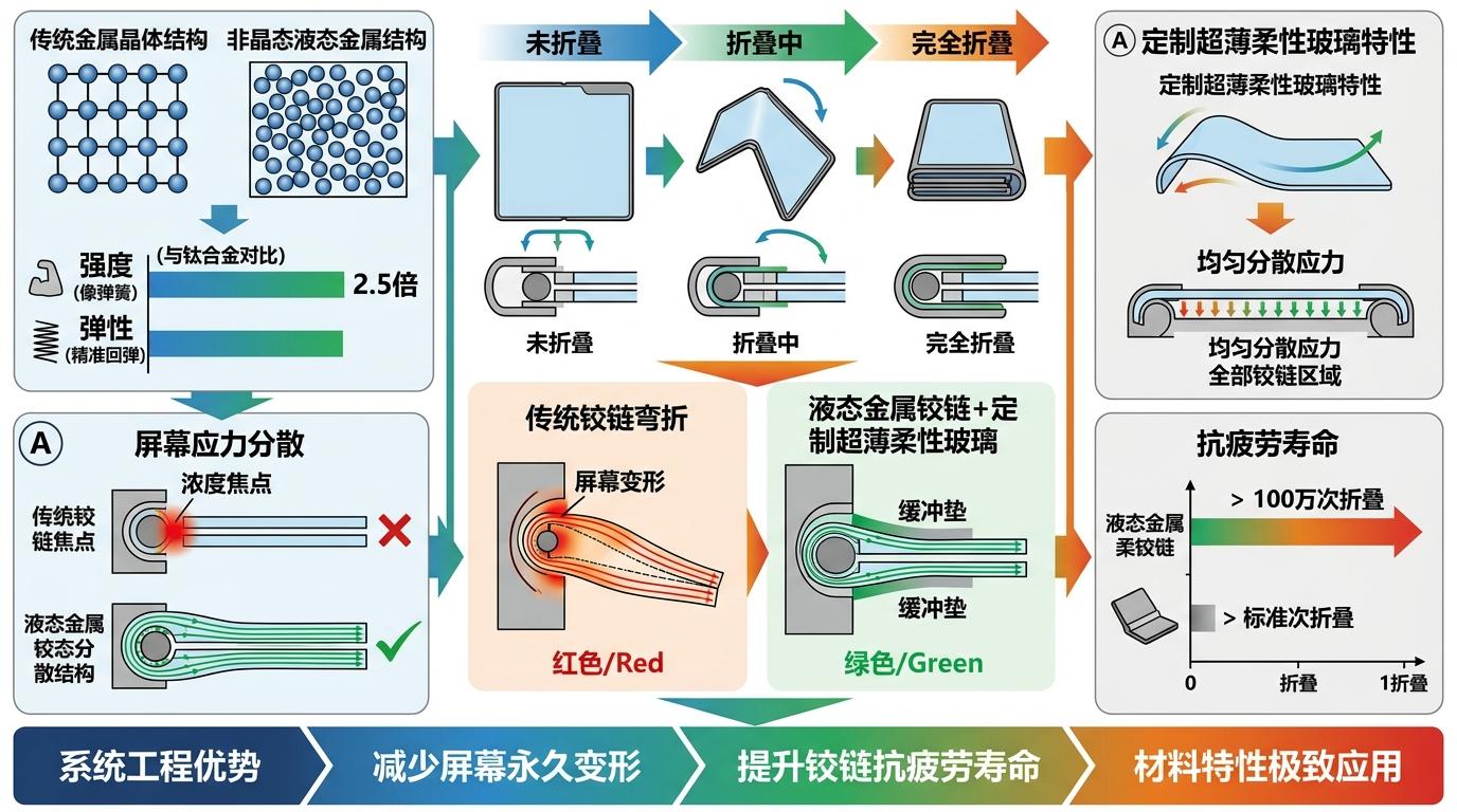 答案藏在液态金属铰链里。这种非晶态合金的原子排列没有传统金属的晶体结构,像被瞬间冻住的液体,既有钛合金2.5倍的强度,又能像弹簧一样精准回弹。配合定制超薄柔性玻璃,它把折叠时的应力均匀分散到整个铰链,而非集中在屏幕中线——就像给反复弯折的钢丝套了一层缓冲垫,既减少了屏幕的永久变形,又把铰链的抗疲劳寿命拉到了百万次以上。这不是简单的材料堆叠,是把材料特性用到了极致的系统工程。