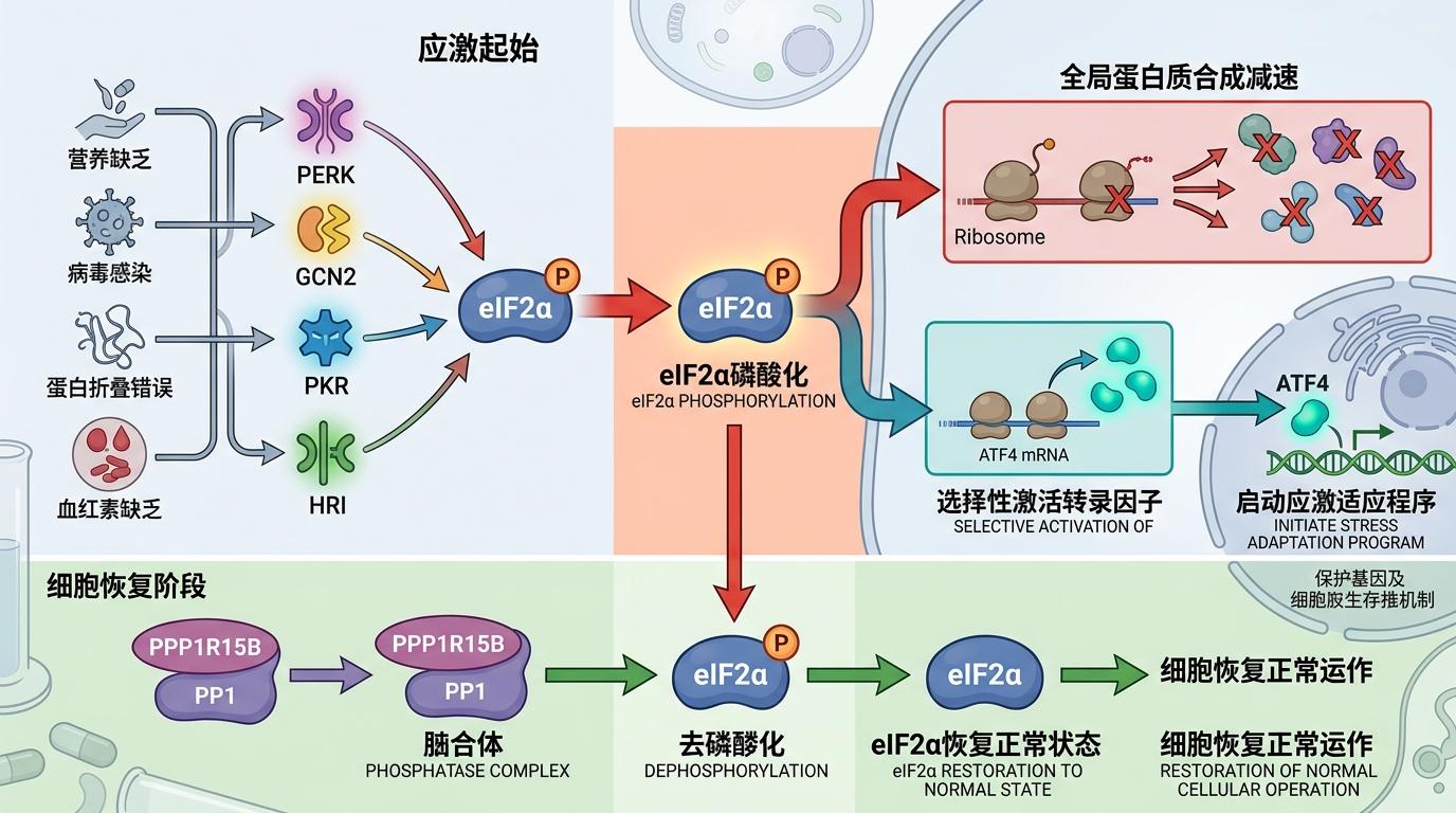 但真实的机制比这更精确:ISR通过四种激酶磷酸化翻译起始因子eIF2α,让全局蛋白质合成减速,却选择性激活转录因子ATF4的翻译,启动应激适应程序。正常情况下,危机解除后,PPP1R15B和PP1组成的磷酸酶复合物会给eIF2α「去磷酸化」,让细胞恢复正常运作。