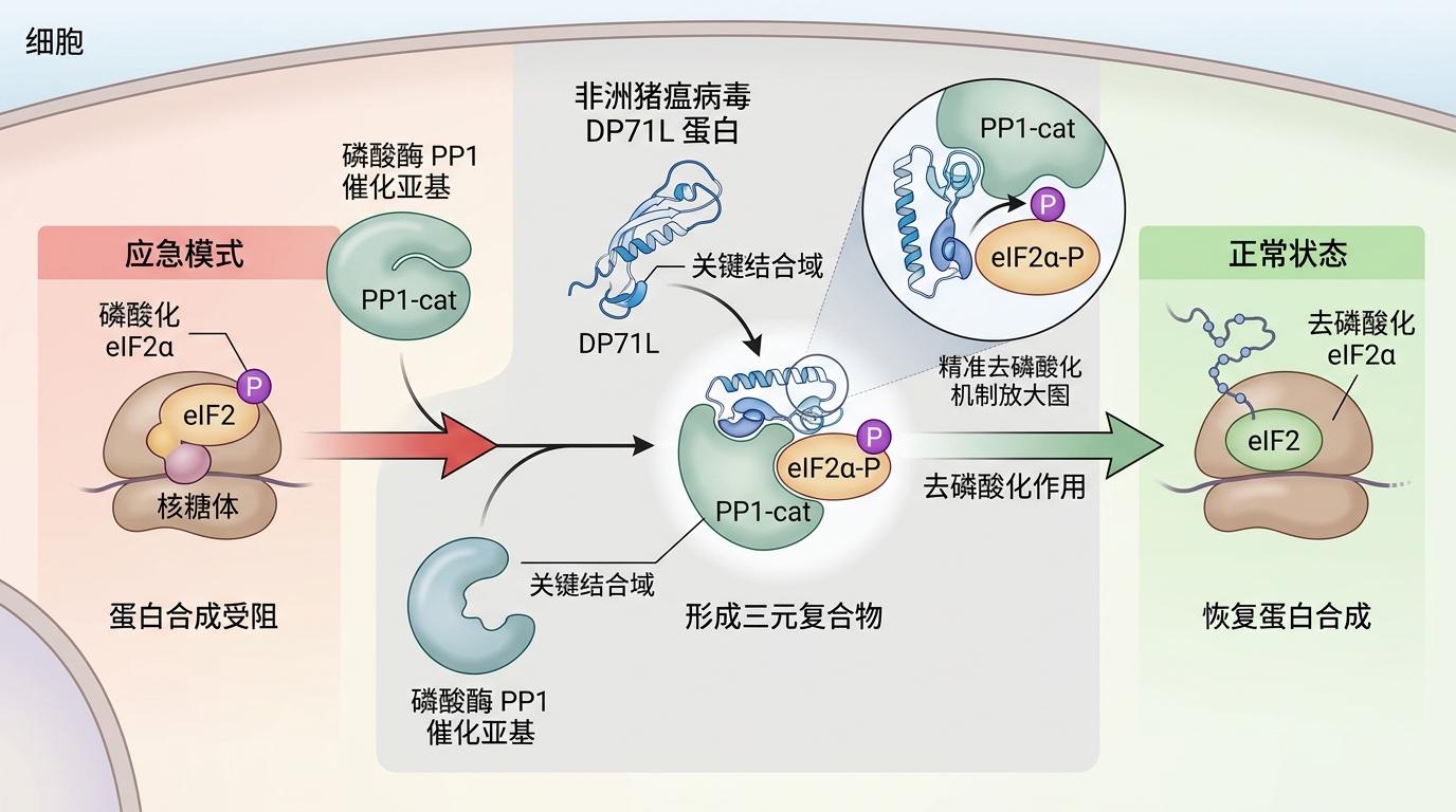 非洲猪瘟病毒编码的DP71L蛋白,就是其中的佼佼者。它是PPP1R15B的病毒同源物,只保留了和PP1、eIF2结合的关键结构,是目前发现的最小的ISR抑制剂。它能精准地让eIF2α去磷酸化,把卡在「应急模式」的细胞拉回正常状态。