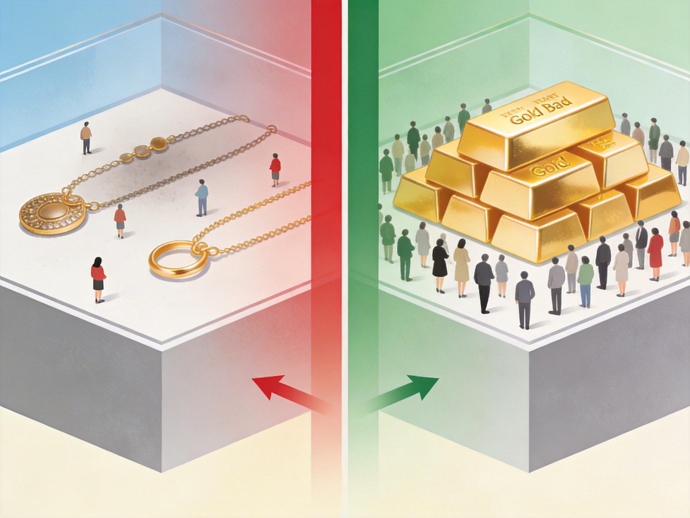 深圳水贝的黄金柜台前,往日里讨价还价的喧闹淡了大半——消费者攥着手机刷着实时金价,手指悬在付款键上迟迟落下。而隔着两条街的银行网点,投资金条的提货单已经排到了三天后:有人拖着行李箱来抄底,一出手就是几百克。同样是黄金,一边是观望的冷,一边是抢筹的热,这种分裂的场景,正戳中黄金最核心的「人格分裂」:它既是戴在脖子上的消费品,也是藏在保险柜里的金融资产。为什么金价波动下,两者的命运会天差地别?