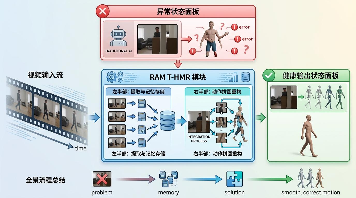 解决了“认人”的问题,接下来是“记动作”。当视频里的人被挡住半个身体,传统AI只能凭着露出来的半条胳膊瞎猜姿态,结果经常生成“胳膊长在肚子上”的怪异动作。RAM的T-HMR模块,就像给AI配了一套“动作拼图”:它会从之前几秒的视频里,把这个人完整的动作片段存成“记忆碎片”,当当前帧的信息残缺时,就用这些碎片拼出完整的姿态。