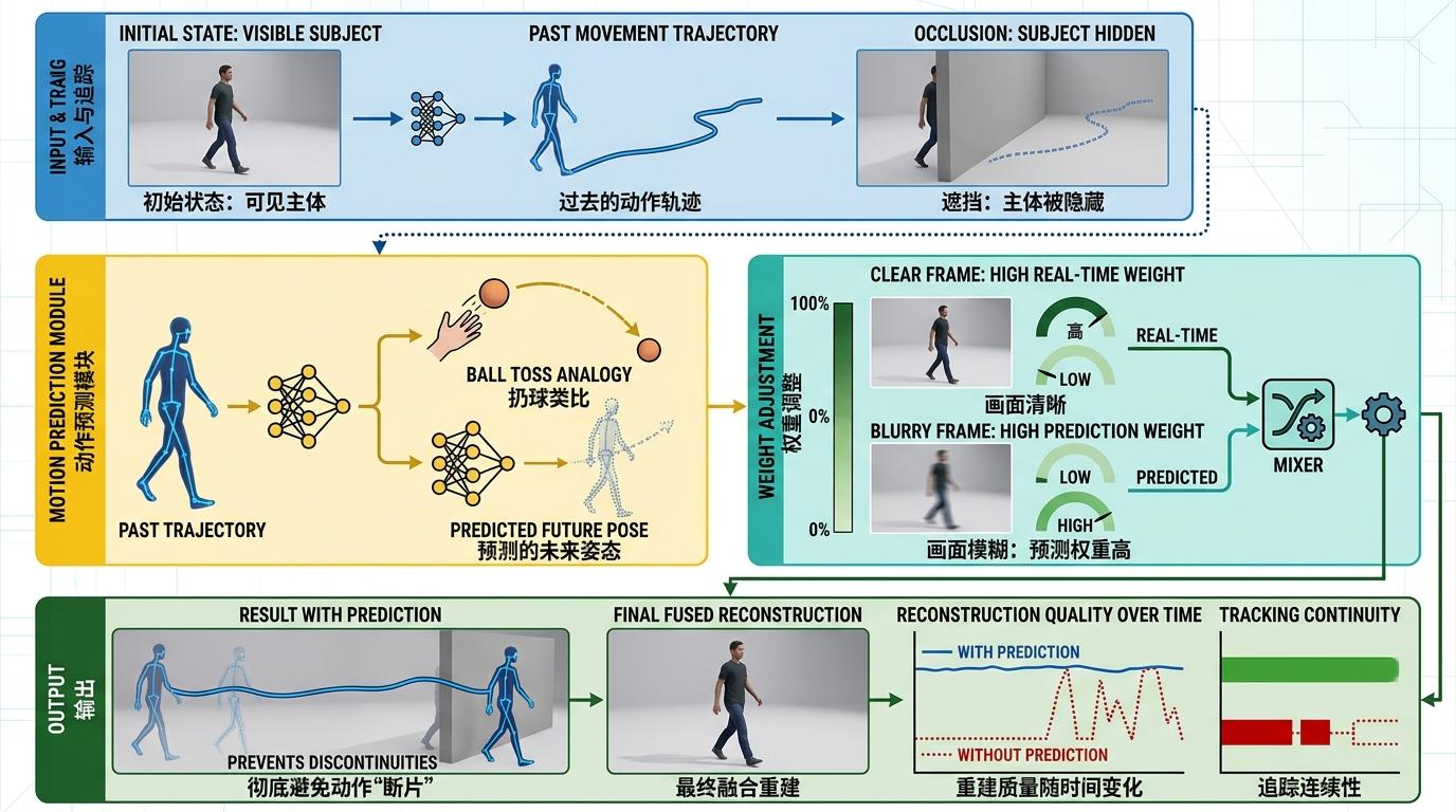 更绝的是动作预测模块——如果一个人被完全挡住,AI会凭着之前记的动作轨迹,预测他接下来的姿态,就像你看别人扔球,能凭着手臂的动作猜出球会飞向哪。最后再由融合模块根据当前画面的清晰度,自动调整“实时重建”和“预测姿态”的权重:画面清楚就信实时结果,画面模糊就多参考预测,彻底避免了动作“断片”。