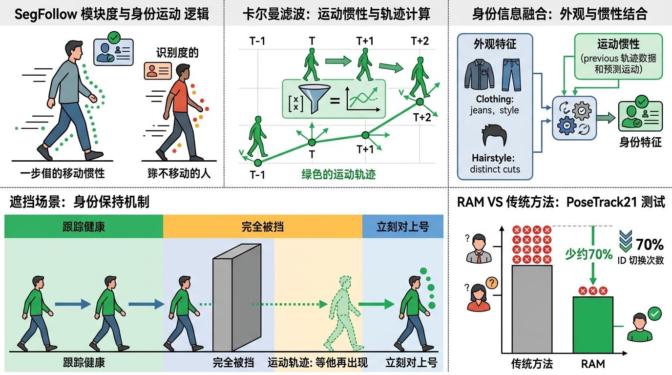 你可以把SegFollow模块想象成AI的“身份小本本”,里面记着每个人的运动惯性——就像你知道朋友走路习惯晃左肩,哪怕他戴了口罩,你也能从背影认出他。这个模块用卡尔曼滤波算法算出每个人的运动轨迹,把“下一秒大概会出现在哪”的惯性信息,和衣服、发型这些外观特征结合起来判断身份。就算有人被完全挡住2秒,AI也能凭着之前记的运动轨迹,等他再出现时立刻对上号。在PoseTrack21数据集的测试里,RAM的ID切换次数比传统方法少了近70%,相当于把认错人的概率降到了原来的三分之一。