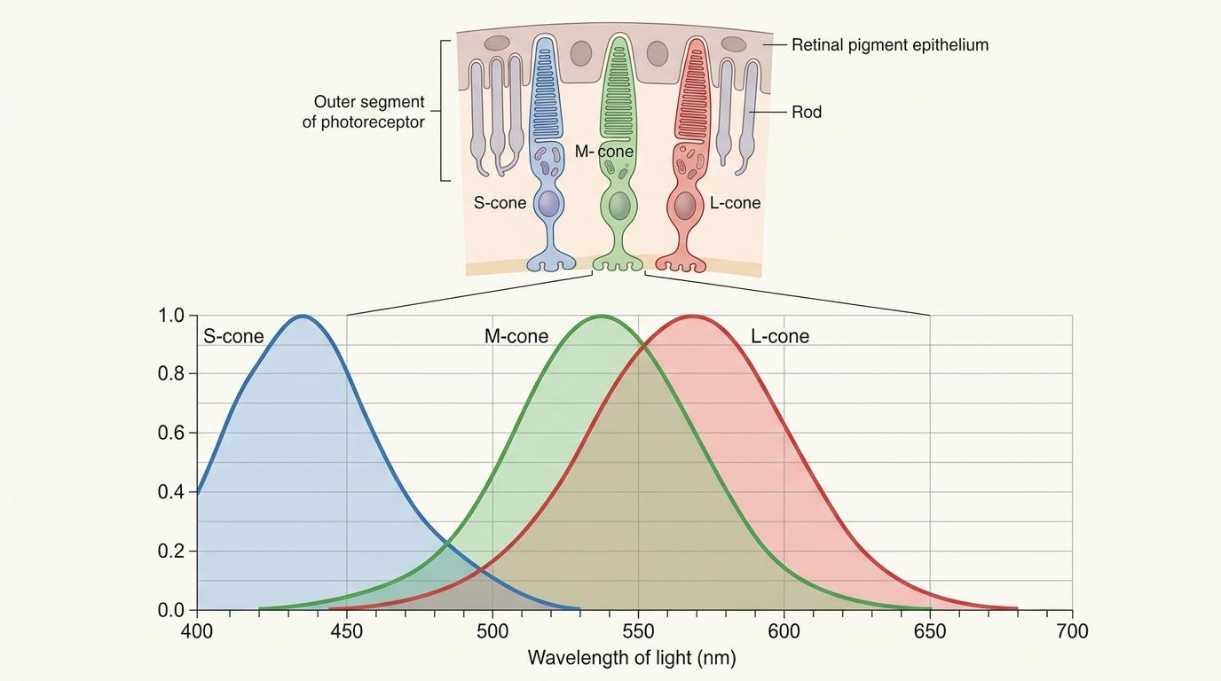 你可以把视网膜上的三种视锥细胞当成三个分工模糊的质检员:S锥盯蓝色,M锥盯绿色,L锥盯红色,但他们的“负责范围”严重重叠——尤其是M锥和L锥,对光线的敏感区间重合度超过85%。