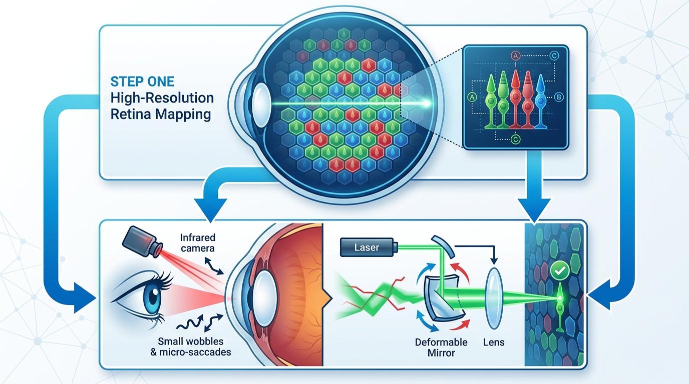 第一步,先给每个人的视网膜画一张“高清地图”:用高分辨率成像技术逐个识别1000多个视锥细胞的类型和位置,精确到微米级——相当于在足球场上找到每一个球员的号码和站位。第二步,用红外光实时追踪眼球的微小转动,同时用自适应光学系统不断校正激光的光路,把光斑缩小到单个视锥细胞的大小——就像给针灸针装了自动瞄准器,精准扎到指定穴位。