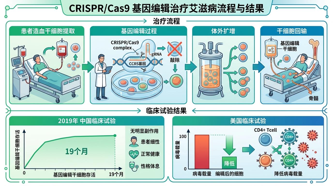 目前最成熟的是CRISPR/Cas9技术:从患者体内取出造血干细胞,用CRISPR敲除CCR5基因,再输回患者体内。2019年中国的临床试验显示,经过编辑的干细胞能在患者体内存活19个月,且没有明显副作用;美国的试验也证明,编辑后的细胞能有效降低病毒载量。