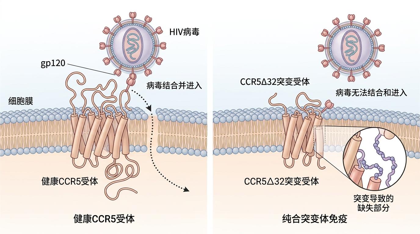 但有些人的CCR5基因天生缺了32个碱基对,也就是**CCR5Δ32突变**——相当于把门把手直接拆了。携带两份这种突变的人(纯合子),对90%以上的HIV毒株天然免疫,北欧人群里每100个人里才有1个这样的“天选者”。