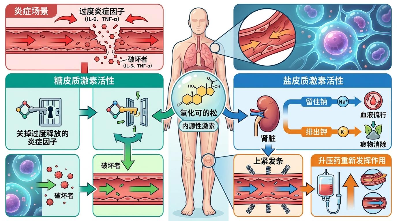 氢化可的松恰好是为这个场景量身定做的内源性激素。你可以把它想象成一个双功能工具包:一层是糖皮质激素活性,能像闸门一样关掉过度释放的炎症因子,比如IL-6、TNF-α这些把血管壁泡得千疮百孔的“破坏者”;另一层是盐皮质激素活性,这是它最独特的优势——能帮着肾脏留住钠、排出钾,像给松弛的血管壁“上紧发条”,让升压药重新发挥作用。