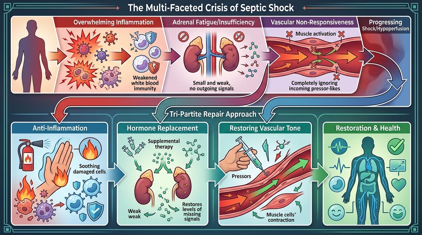 脓毒症休克从来不是单一的“炎症风暴”,它是一场三重灾难:过度炎症烧穿了免疫防线,肾上腺功能跟不上需求,血管对升压药彻底“麻木”。这时候,身体需要的不是单纯的“抗炎灭火器”,而是能同时干三份活的“全能维修工”。