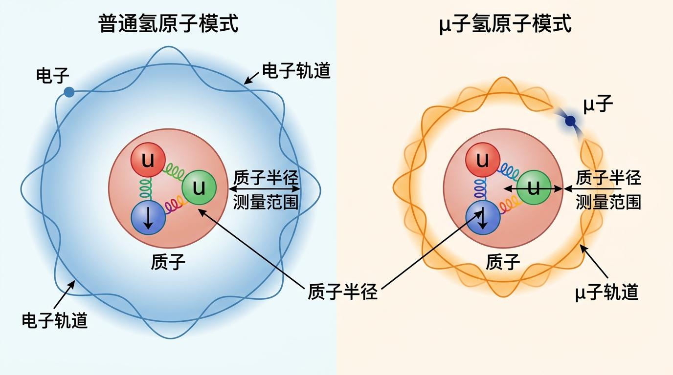 故事要从2010年的瑞士保罗谢勒研究所说起。当时一支国际团队用μ子替代氢原子中的电子,测出了小得多的质子半径。μ子质量是电子的207倍,轨道半径只有电子的1/200,能更贴近质子核心,让质子尺寸对能级的影响放大200倍。但这个结果与传统电子散射、氢原子光谱测量的数值偏差达到5个标准差,完全超出了实验误差的范畴——质子半径之谜由此诞生。