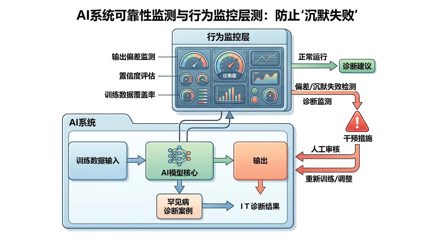 在工程层面,AI系统的可靠性还要解决「沉默失败」的问题。传统软件故障会直接报错,但AI可能在表面正常的情况下,输出逐渐偏离正确结果。比如医疗AI在诊断罕见病时,可能因为训练数据不足给出错误建议,但系统不会提示任何异常。为了应对这种情况,工程师需要给AI加上「行为监控层」,就像给机器装上仪表盘,实时监测AI的输出是否符合预期,一旦发现偏差就及时干预。