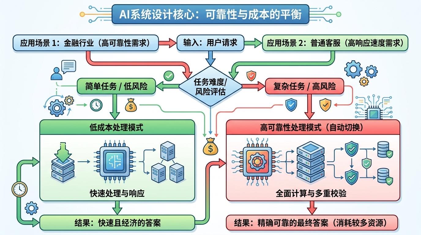 在产业应用中,可靠性和成本的平衡更是难题。比如金融行业需要AI100%可靠,但过高的计算成本会让企业难以承受;而普通的客服AI,可能不需要那么高的可靠性,更看重响应速度和成本。因此,现在的AI开始推出「难度分级」:在处理简单任务时用低成本模式,快速给出答案;在处理高风险任务时,自动切换到高可靠性模式,消耗更多资源确保结果正确。