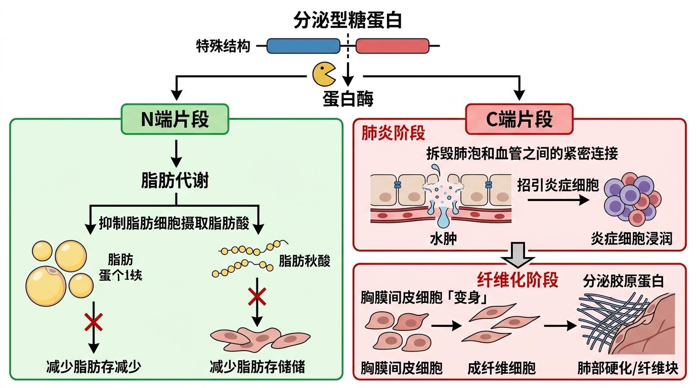 它是个结构特殊的分泌型糖蛋白,被蛋白酶切成两半后各干各的:N端片段管脂质代谢,能抑制脂肪细胞摄取脂肪酸;C端片段则专搞破坏——在肺炎时它会拆毁肺泡和血管之间的紧密连接,让体液漏进肺里形成水肿,还会招引炎症细胞疯狂浸润;到了纤维化阶段,它又会推着胸膜间皮细胞「变身」成成纤维细胞,玩命分泌胶原蛋白,把肺变成硬邦邦的纤维块。