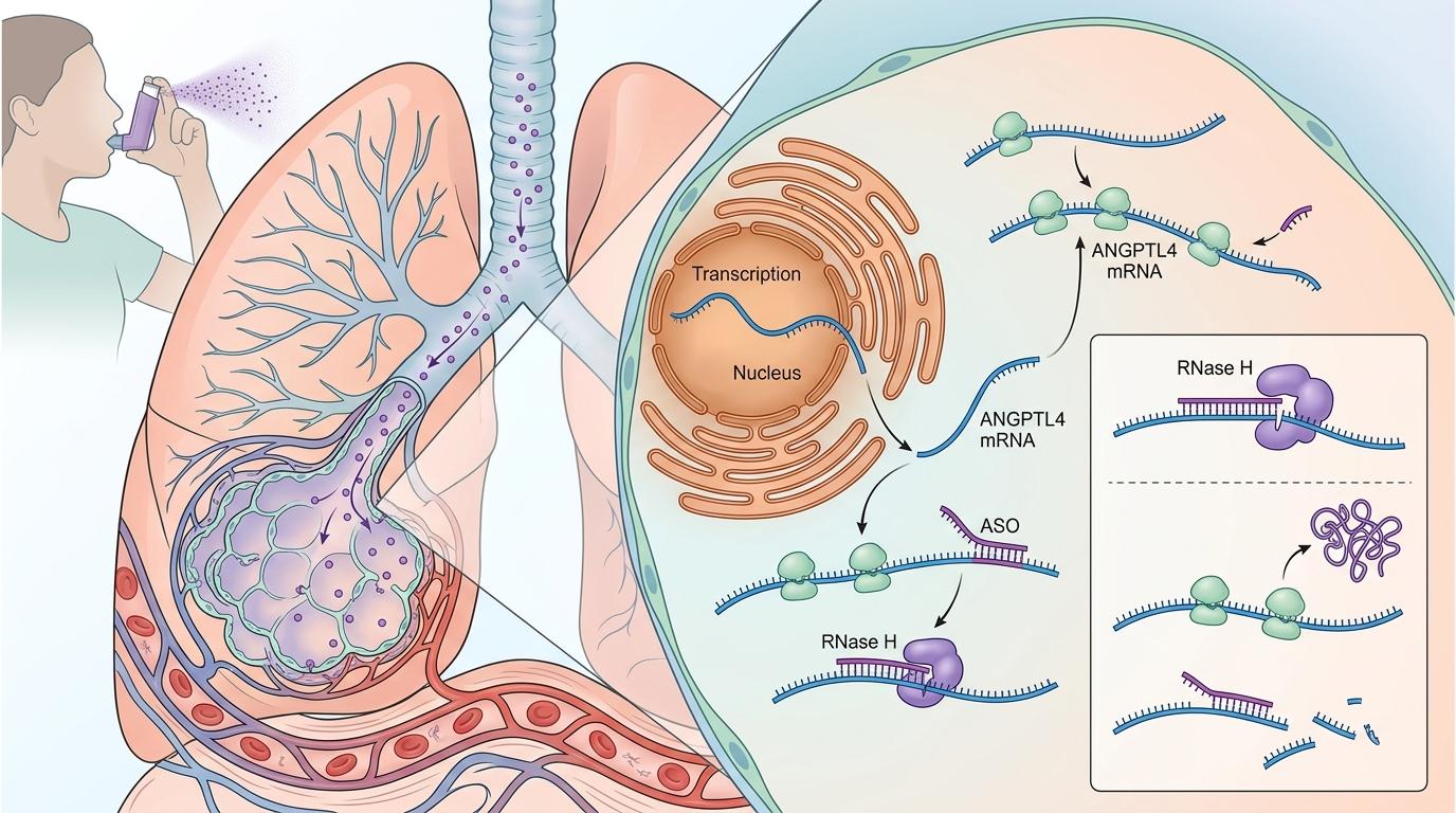 研究团队用的是反义寡核苷酸(ASO)技术,简单说就是一段能和ANGPTL4的mRNA精准配对的小RNA,一旦配对成功,就能阻止mRNA翻译成蛋白,相当于在基因转录的最后一步给它踩了刹车。为了让这款ASO只去肺里,他们选择了吸入给药的方式——就像哮喘病人吸激素一样,药物直接沉积在肺泡表面。