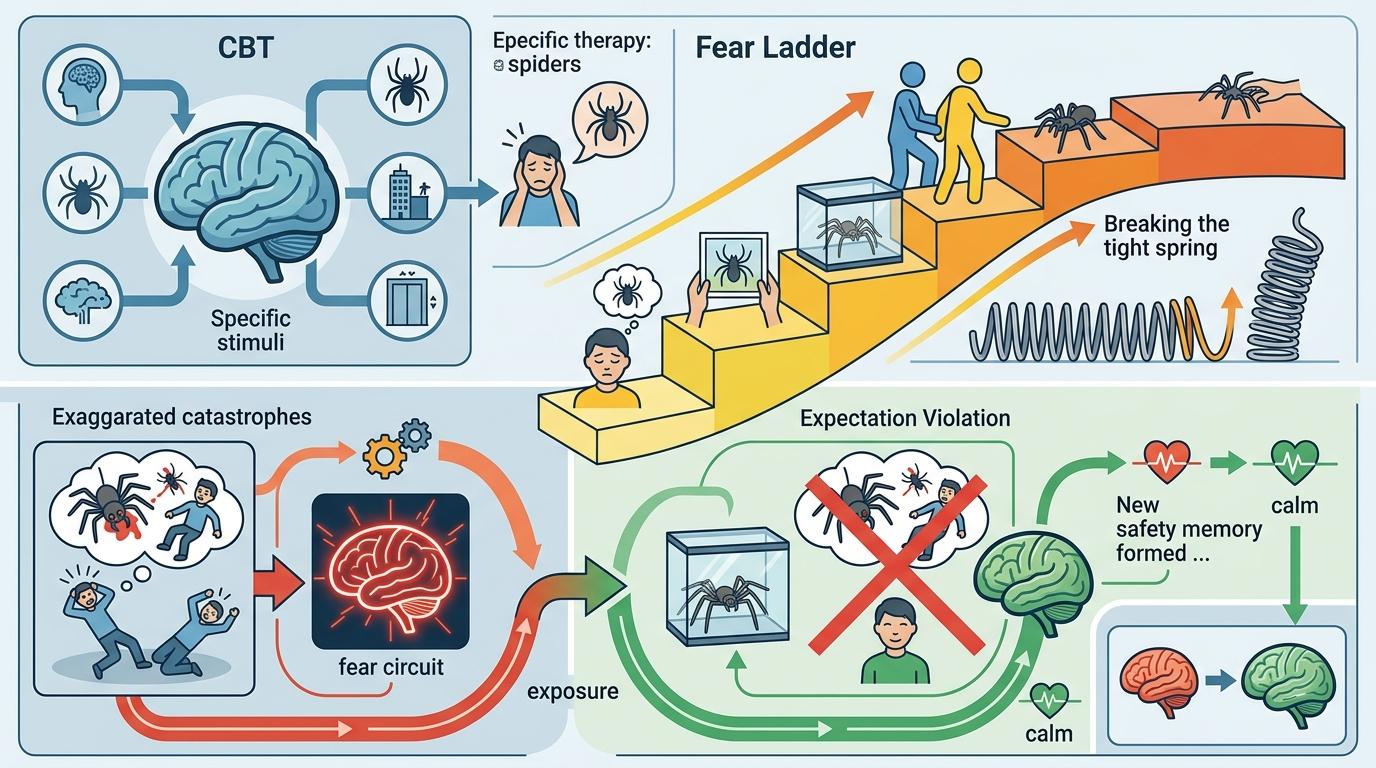 先从更直观的暴露疗法说起。它是认知行为疗法(CBT)的核心技术,针对的是具体的恐惧刺激——比如蜘蛛、高空、密闭空间。治疗师会和患者一起搭建一个「恐惧阶梯」:先想象蜘蛛,再看照片,接着看玻璃盒里的活蜘蛛,最后亲手触摸。整个过程像拆解一个紧绷的弹簧,让患者在安全的环境里反复确认:那些脑补的灾难,比如蜘蛛咬死人、自己当场崩溃,并没有发生。这种「期待违背」会在大脑里建立新的安全记忆,慢慢覆盖旧的恐惧回路。