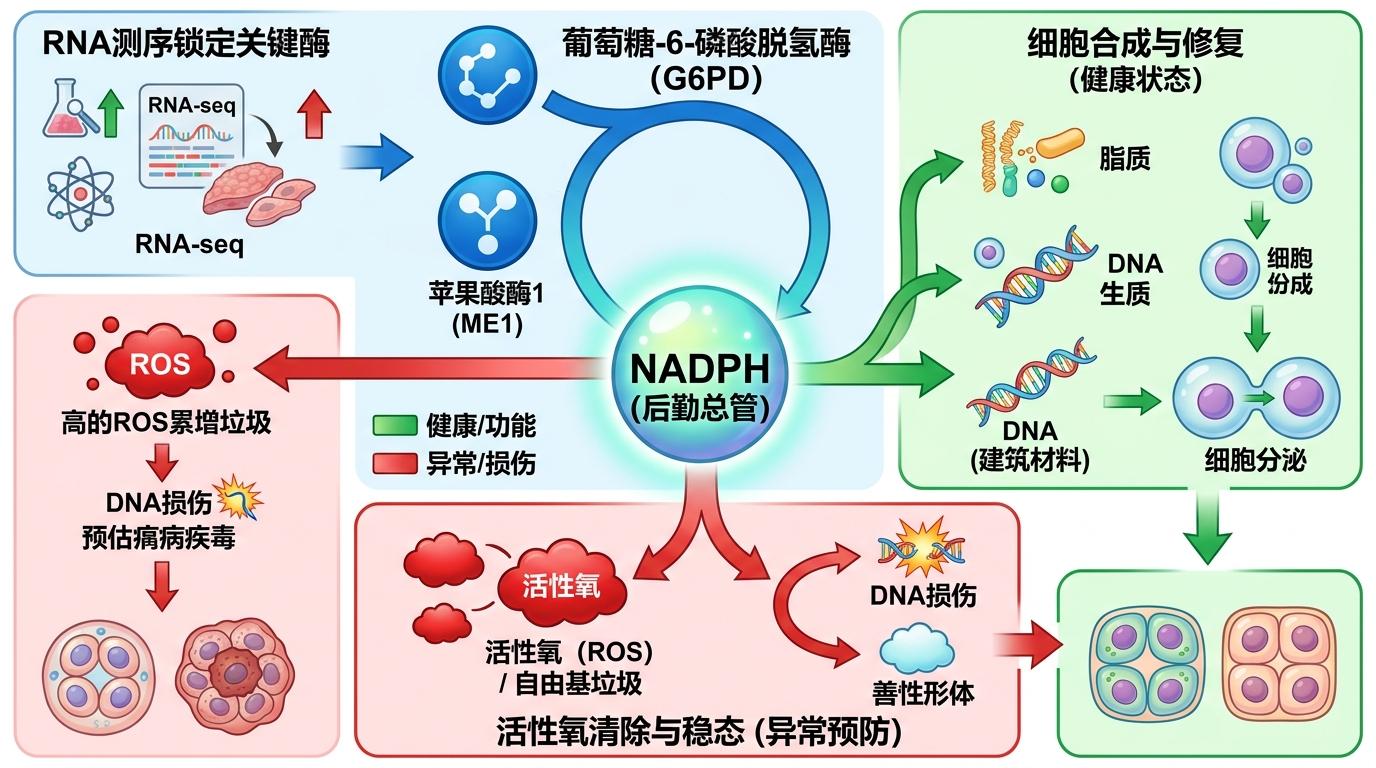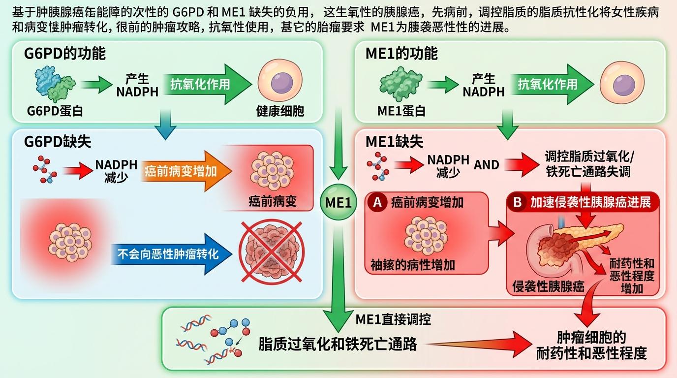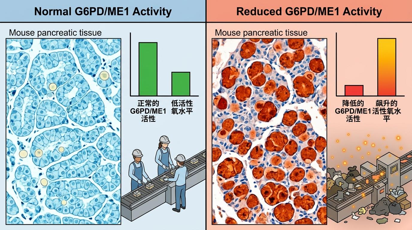 研究团队首先对胰腺化生组织和癌前病变组织做了RNA测序,结果锁定了两个异常升高的酶:葡萄糖-6-磷酸脱氢酶(G6PD)和苹果酸酶1(ME1)。这两种酶的共同作用,是制造一种叫NADPH的分子——你可以把它看成细胞的“后勤总管”:一方面给细胞合成脂质、DNA等“建筑材料”提供能量,另一方面还能清除细胞里的活性氧(ROS),这种物质就像细胞里的“自由基垃圾”,积累过多会损伤DNA,催生病变。