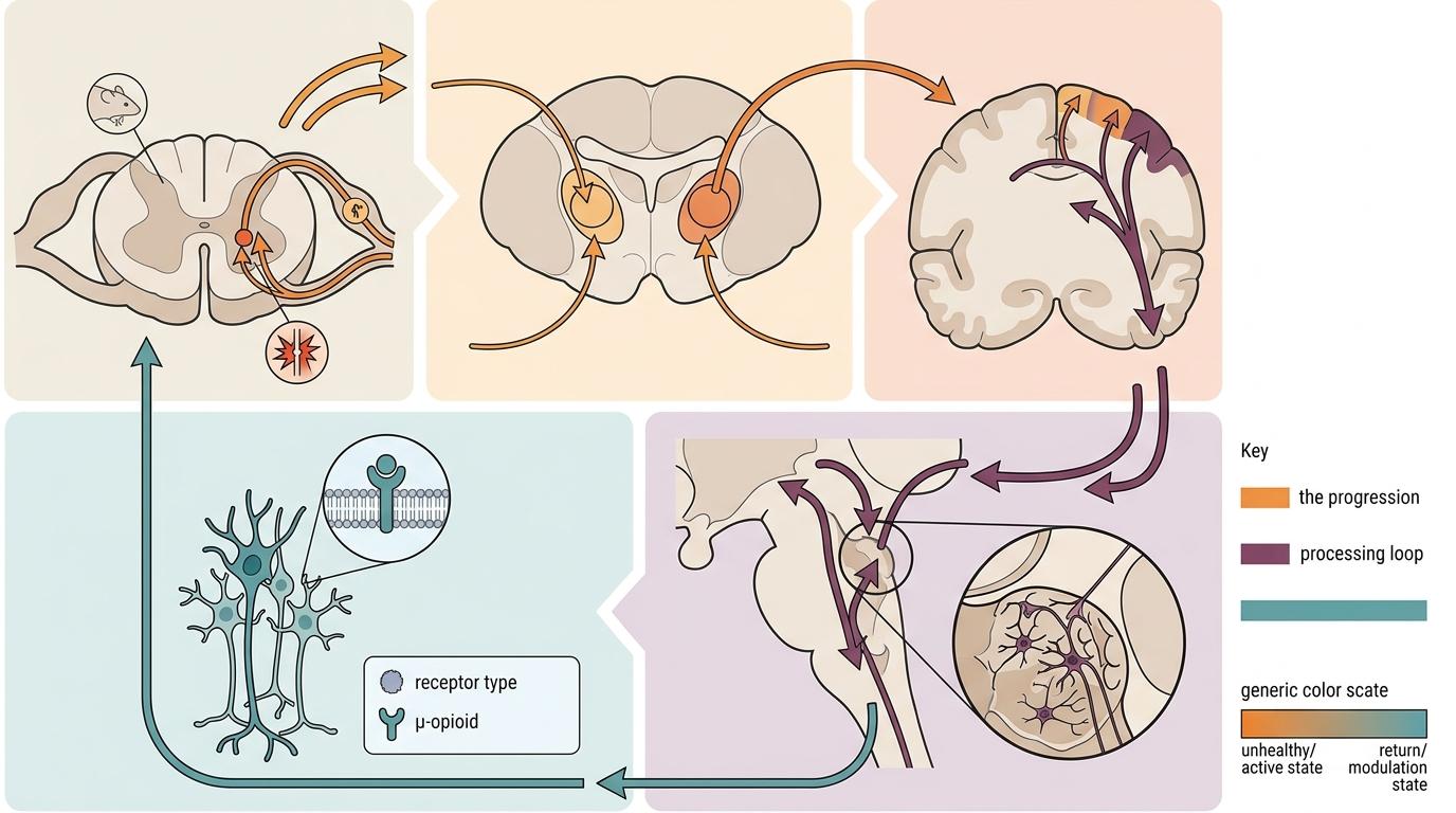 斯坦福团队用基因标记、病毒追踪等技术,在小鼠身上完整画出了这条慢性痛环线的路线:从脊髓出发,先到丘脑的两个中转站,再传到大脑的初级躯体感觉皮层,接着拐到脑干的外侧上丘,最后通过一群带μ-阿片受体的神经元绕回脊髓,形成一个完美的闭环。