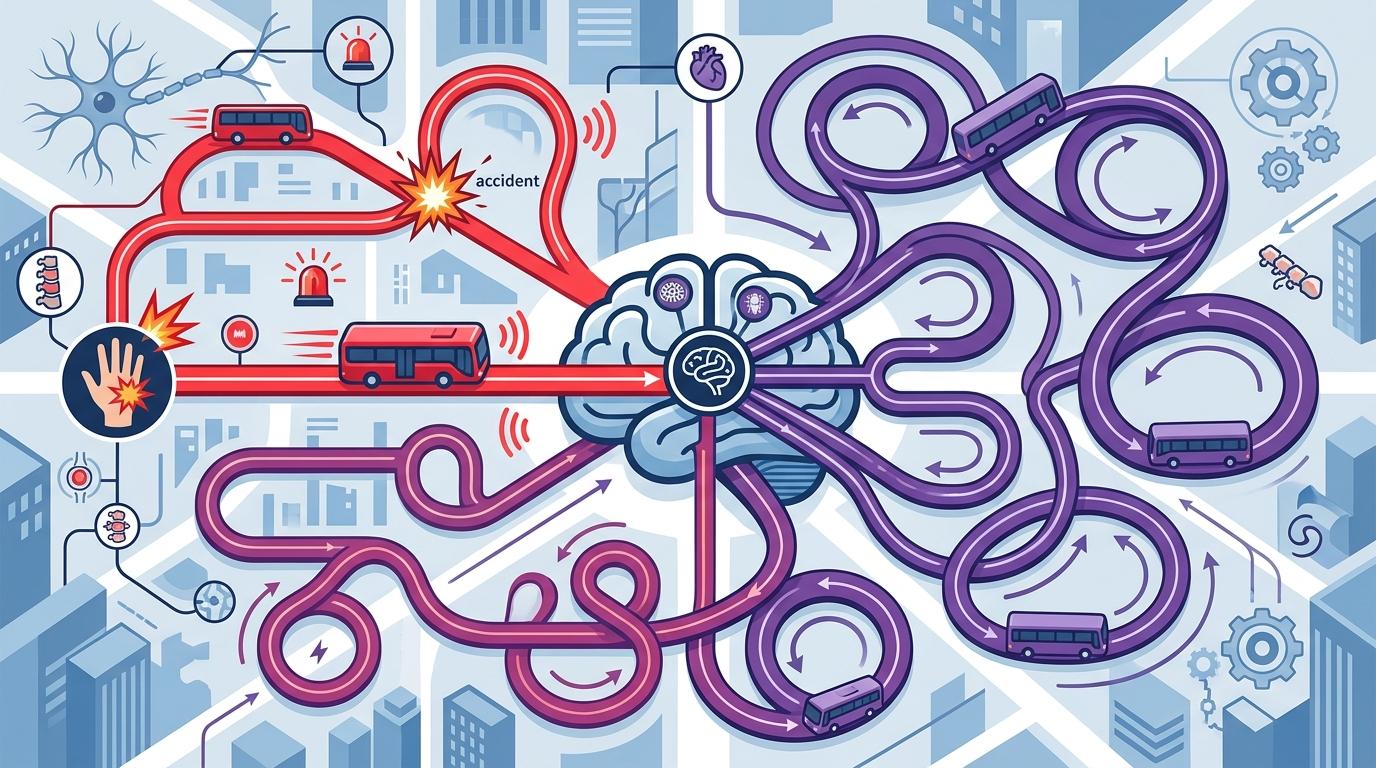 你可以把疼痛的神经通路想象成城市里的两条公交线路:一条是直达的「急性痛快线」,出了事故立刻拉响警报;另一条是绕圈的「慢性痛环线」,一旦启动就没完没了地兜圈子。