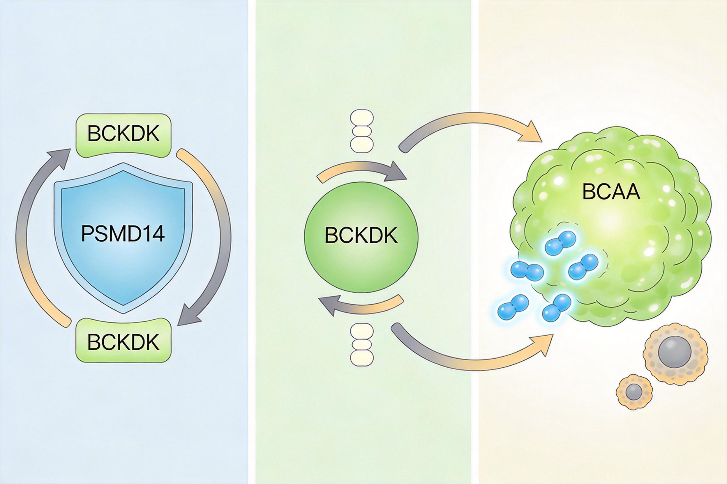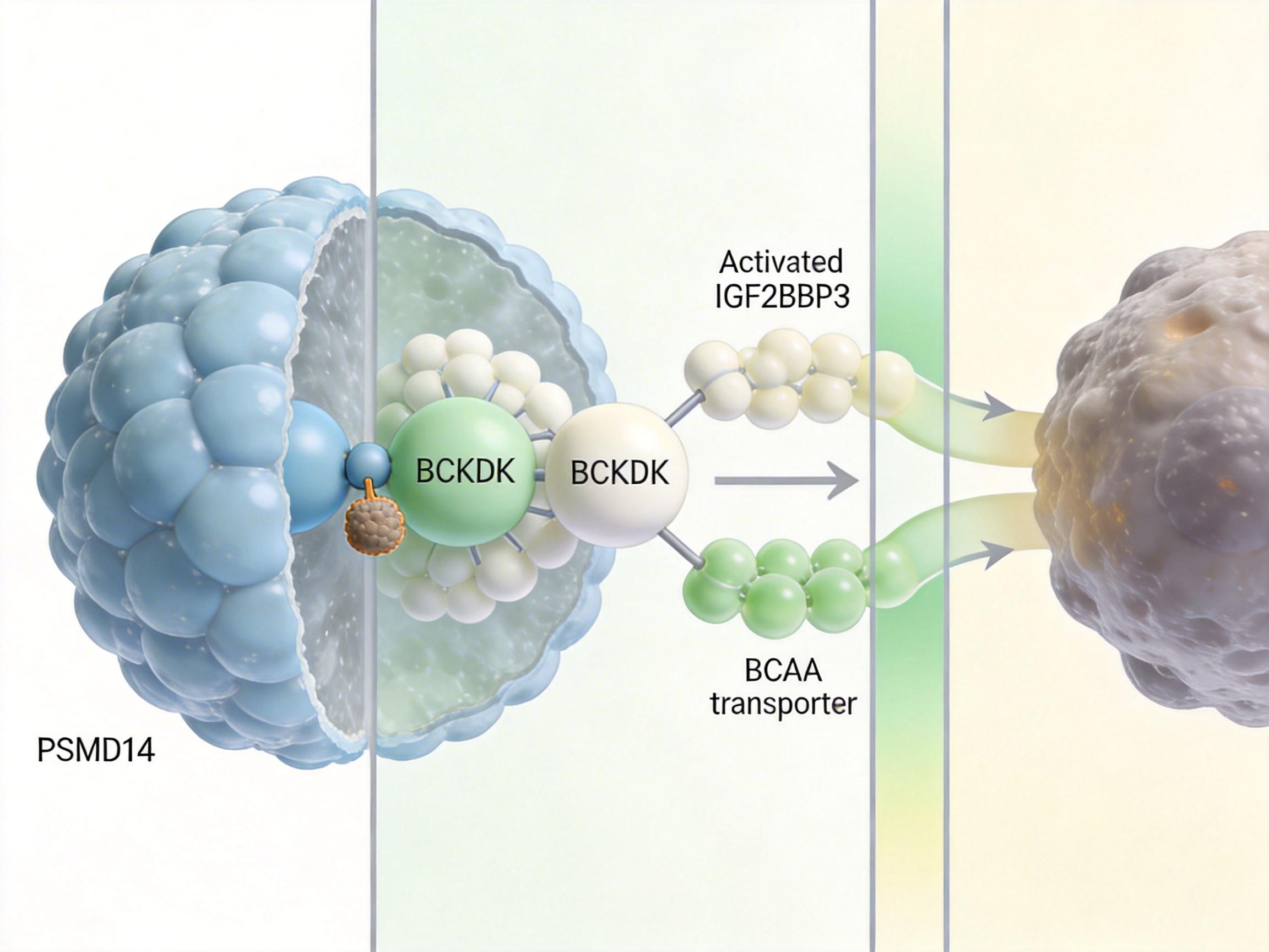PSMD14是这套系统的「保护伞」,它会找到调控BCAA代谢的关键酶BCKDK,帮它去掉会被降解的「标记」,让BCKDK能持续工作。BCKDK则会激活另一个蛋白IGF2BP3,后者像个「采购员」,专门负责给肿瘤细胞多买BCAA转运蛋白,让肿瘤能疯狂吸收环境里的BCAA。