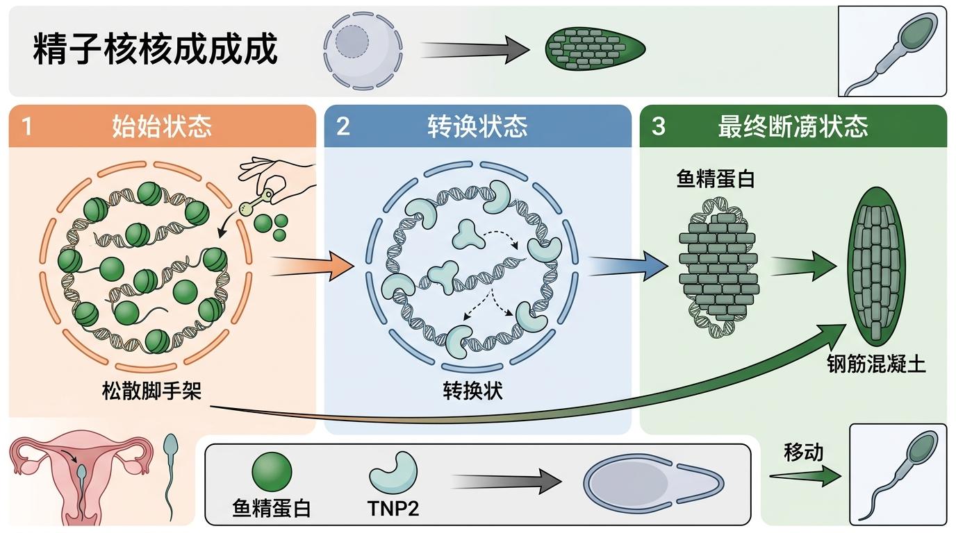 你可以把精子的细胞核成熟过程,想象成一场精准的拆迁重建:最初的遗传物质像搭在组蛋白上的松散脚手架,先换成过渡蛋白TNP2这种临时支架,最后必须全部拆除,换成鱼精蛋白打造的“钢筋混凝土”——只有这样,精子才能拥有流线型的头部,扛过生殖道的重重关卡,顺利和卵子结合。