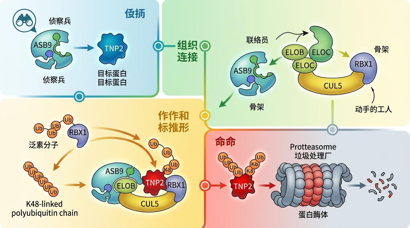 ASB9不是单打独斗。它会组装出一支睾丸特有的“分子拆迁队”——CRL泛素连接酶复合体,成员包括ELOB/C、CUL5和RBX1。 你可以把这个复合体的工作逻辑理解成:ASB9是“侦察兵”,专门识别目标蛋白TNP2;ELOB/C是“联络员”,负责连接侦察兵和核心执行单元;CUL5是“骨架”,支撑整个队伍的结构;RBX1则是“动手的工人”,把泛素分子像标签一样贴在TNP2上。被贴上K48型泛素标签的TNP2,会被细胞内的“垃圾处理厂”蛋白酶体精准降解。