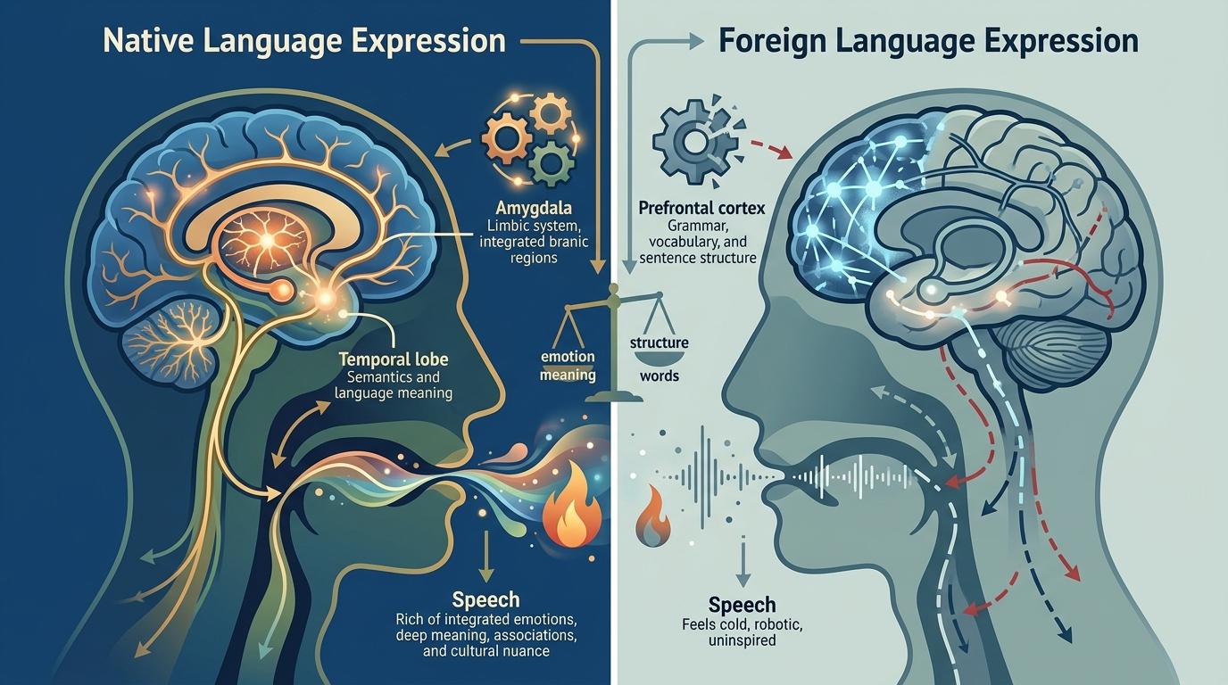 比如,当你用母语表达悲伤时,大脑里处理情绪的杏仁核和负责语义的颞叶会同时亮起来,说出口的话自带体温;但用一门半生不熟的外语说同样的感受,可能只有负责语法和词汇的前额叶在费力运转,像念一段没有感情的台词。这就是为什么史蒂芬用德语写致敬信时,明明有满肚子的感激,却凑不出一句得体的学术表达——他的德语「状态空间」里,只有日常对话的零散条目,没有学术致敬的完整书架。