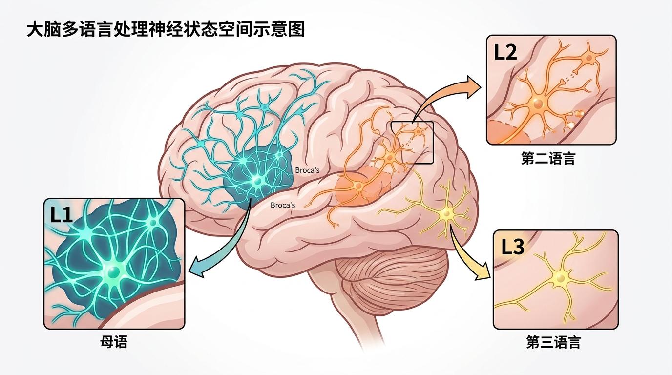 你可以把多语者的大脑想象成一套带分区的书架:母语是最常用的那层,书脊朝外、随手可及;第二语言可能是顶层的旧书,要踮脚够、翻起来还卡壳;第三语言或许是储物箱里的画册,只记得零星画面。神经科学家把这种现象叫做「神经状态空间」——每种语言对应大脑里一套独立但部分重叠的神经网络,激活时调用的脑区、认知资源甚至情感浓度都不一样。