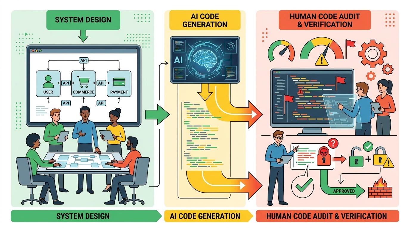 在某全球科技巨头的团队里,工程师们已经不用自己敲基础代码了。他们先画出系统的整体框架,比如“这个电商平台要分用户、商品、支付三个核心模块,模块之间用API打通”,然后把具体的代码编写任务丢给AI工具。AI会快速生成代码,但工程师要做的是审核每一行代码的逻辑,确保它符合整体架构,不会留下安全漏洞——有研究显示,AI生成的代码里,30%-45%都藏着安全隐患。