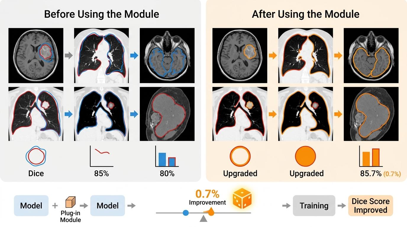 最关键的是,这两个策略都是「即插即用」的——不用动主流分割模型的核心结构,只要在训练前或训练中加个模块就行。在nnU-Net、SwinUNet、VMamba三种不同架构的模型上,DUO都能稳定提升0.6%到0.7%的Dice分数,在病灶边界的分割上,橙色的AI预测线比原来的蓝色线更贴近红色的真实边界。