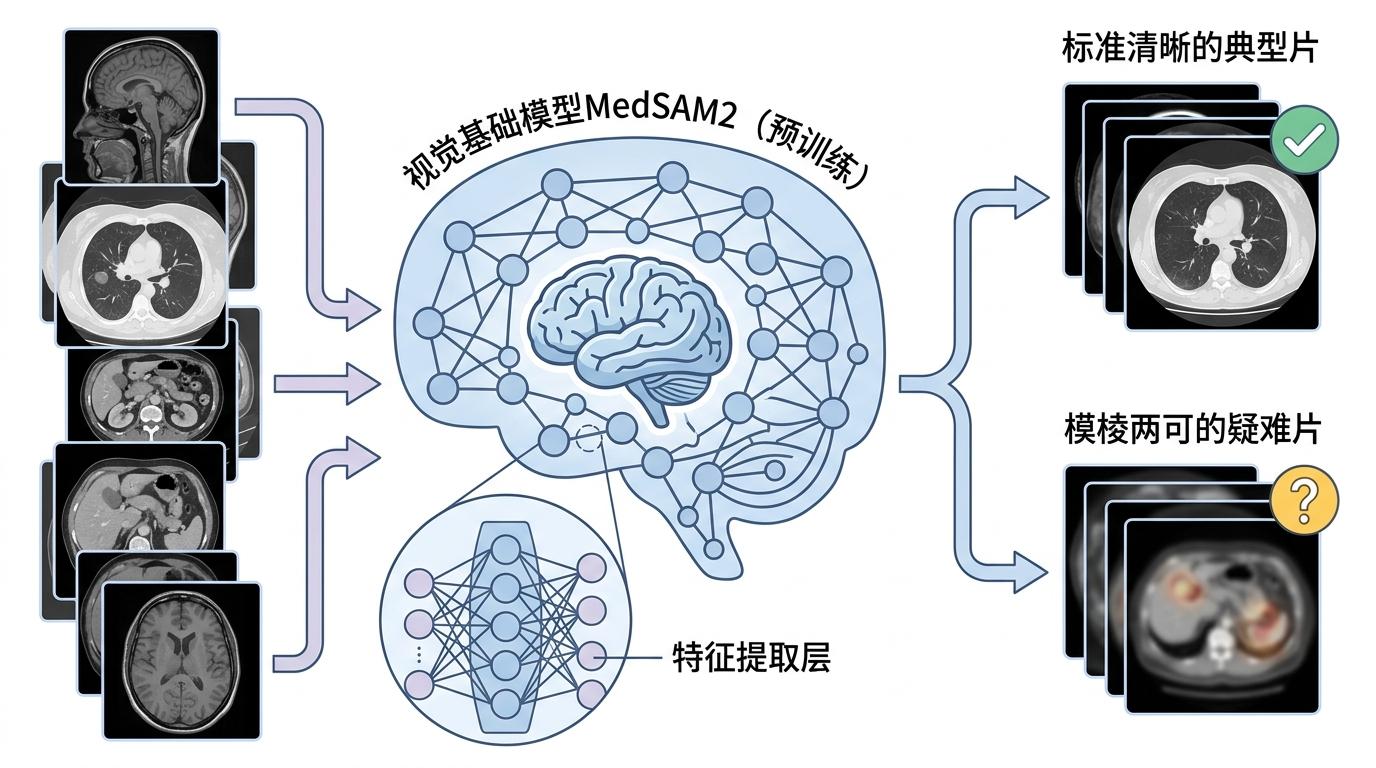 西电团队的办法是,请个「见多识广的老专家」来先审一遍题:用MedSAM2这类在百万级医学图像上预训练过的视觉基础模型,给每一张输入图像提取特征。你可以把这个过程理解成,让资深放射科医生快速扫一遍所有片子,标记出哪些是「模棱两可的疑难片」,哪些是「标准清晰的典型片」。