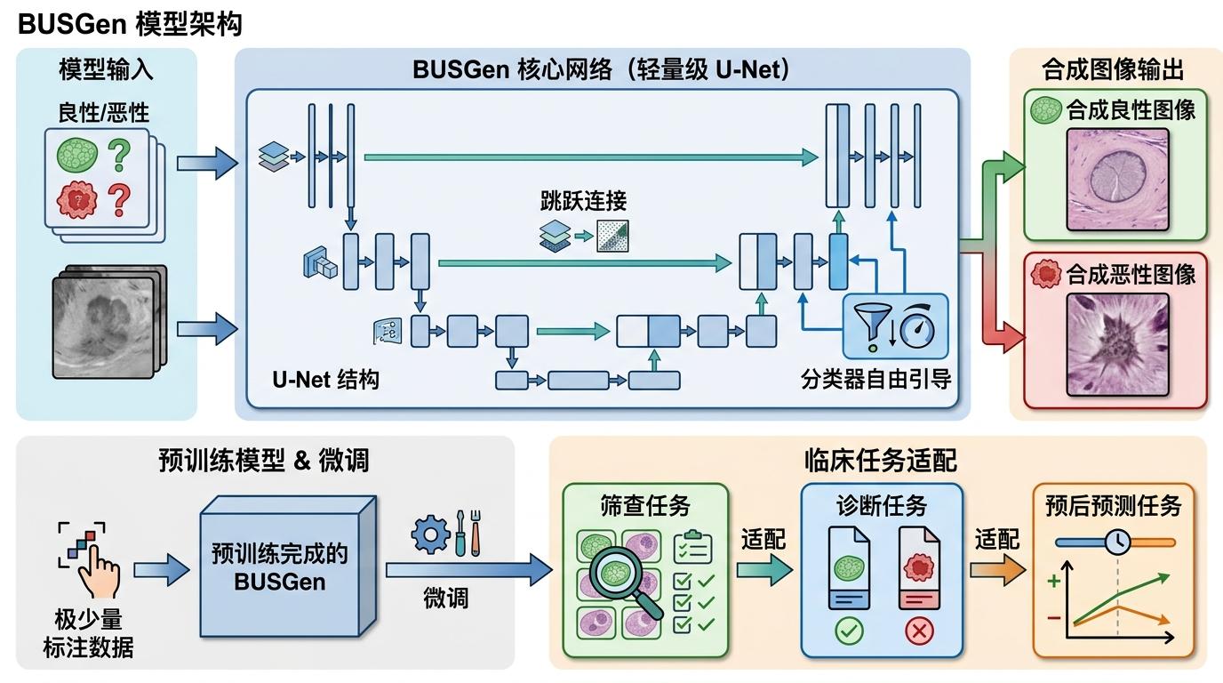 但真实的机制比这更精确:BUSGen用轻量级U-Net架构做骨干,通过「跳跃连接」保留图像的细节纹理,再用「分类器自由引导」技术,让它能根据病灶的良恶性标签,生成对应特征的合成图像。预训练完成后,它只需要极少量的标注数据微调,就能快速适配筛查、诊断、预后预测等不同临床任务。