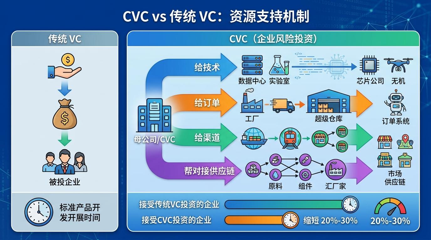 二是资源。传统VC能给的主要是钱,CVC却能掏出“全家桶”:给技术,比如赛力斯可以把自己的智能驾驶技术开放给被投的半导体公司;给订单,比如某机器人初创公司拿到京东的投资,等于直接拿到了超级仓库的入场券;给渠道,甚至能帮被投企业对接上下游供应链。数据显示,接受CVC投资的企业,产品上市周期平均能缩短20%-30%。
