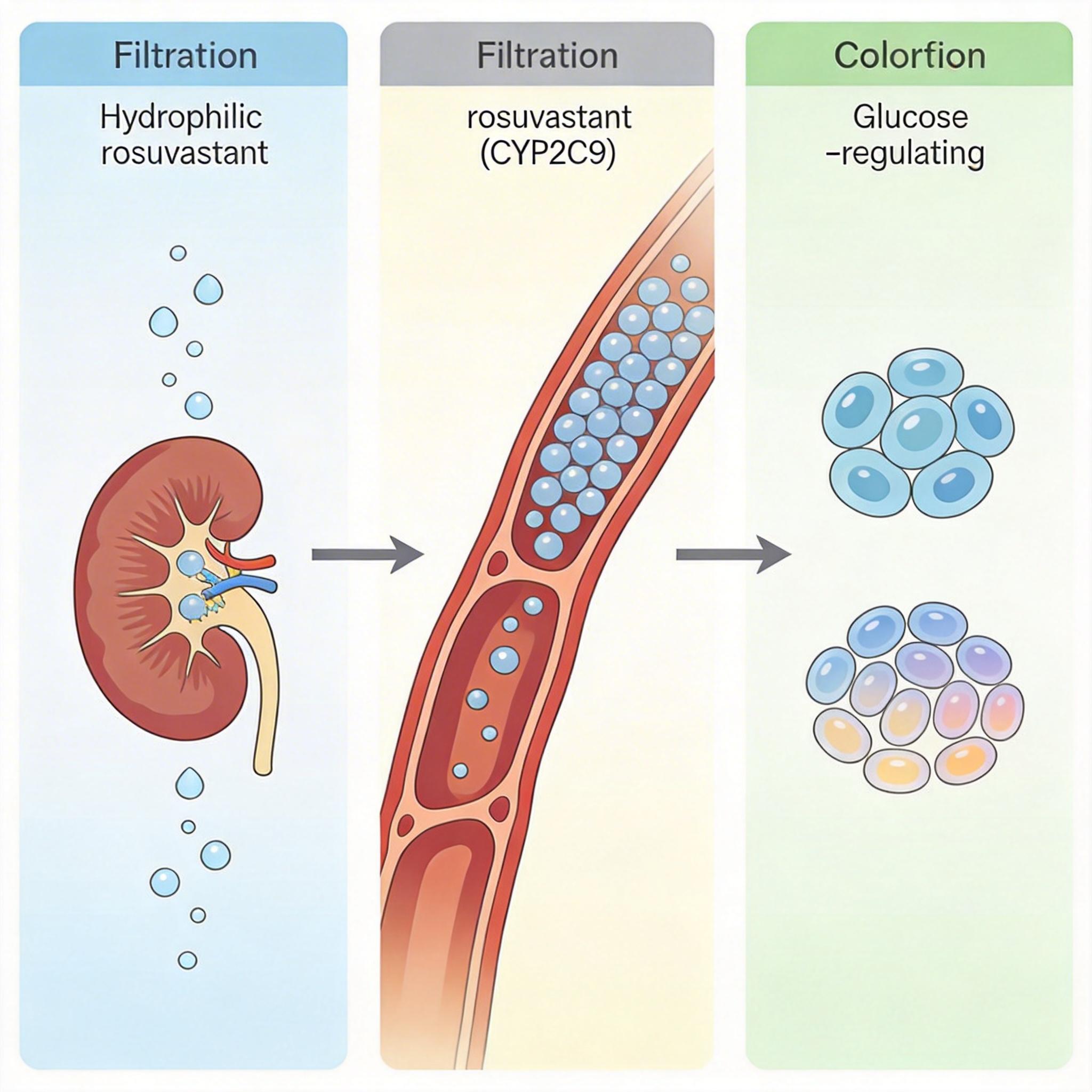瑞舒伐是亲水性的,更像个水分子,大部分直接原封不动从肾脏排出去,只靠少量CYP2C9酶代谢,所以和其他药物“打架”的风险低很多,适合同时吃多种药的患者。但亚洲人因为基因差异,瑞舒伐的血药浓度比欧美人高两倍,所以一般从5毫克小剂量开始吃,慢慢加量。还要注意,它可能和新发糖尿病风险略高有关——每100个吃瑞舒伐的人里,比吃阿托伐的多1-2个得糖尿病。