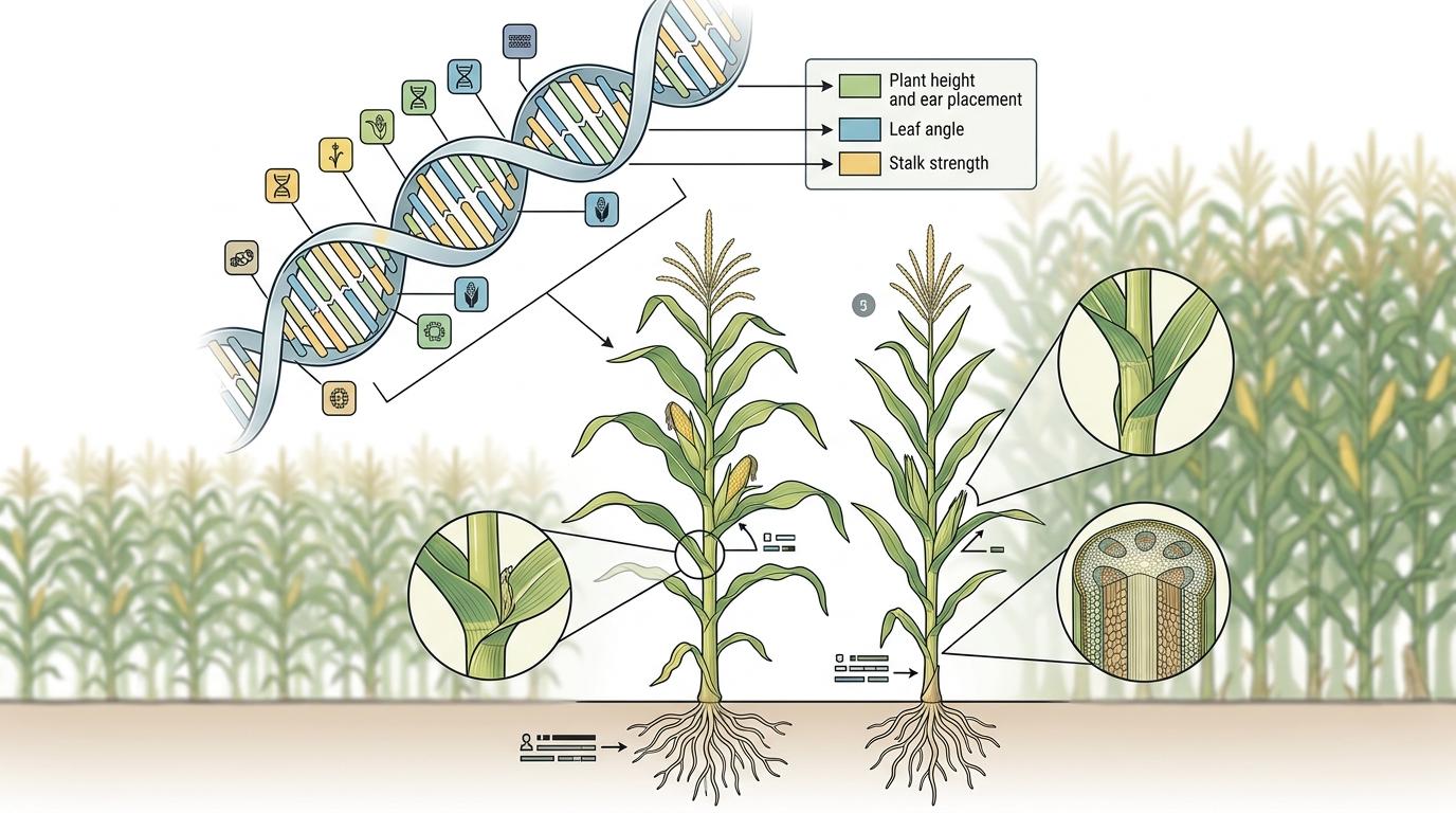 你可以把玉米的基因组想象成一本写满生长指令的说明书,每一个基因就是一行代码。有些代码让玉米长得高,有些让它的叶子更直,有些让它的秆更结实。育种家要找的,就是那些能让玉米适应密植的「优良代码」——也就是有利等位基因,简单说就是同一基因的「优秀版本」。