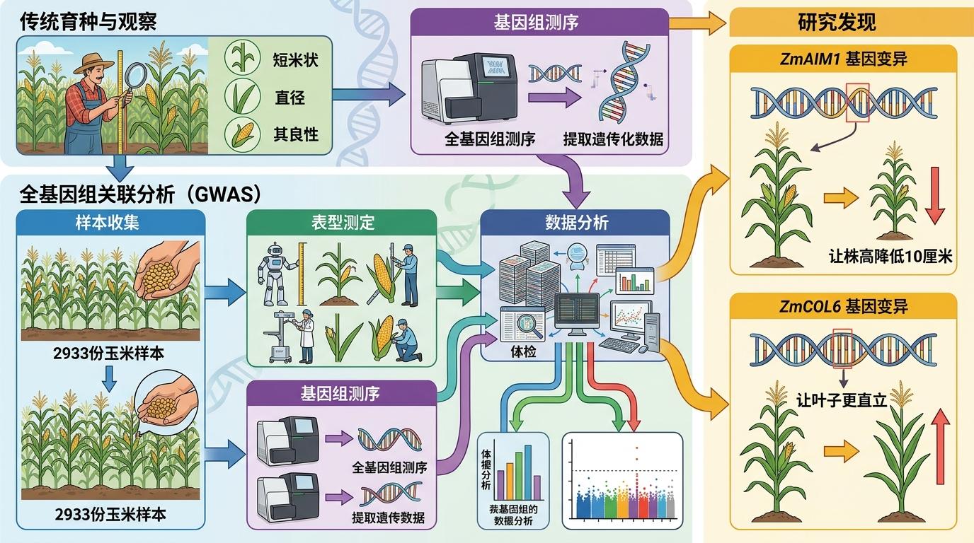 过去,育种家只能通过观察玉米的外在表现选种子,比如挑秆矮、叶子直的,但不知道背后是哪些基因在起作用。这次研究团队用了**全基因组关联分析(GWAS)**——相当于给2933份玉米样本做了全基因组「体检」,把每一个基因的版本和玉米的外在性状对应起来。比如他们发现,ZmAIM1基因的某个版本能让株高降低10厘米,ZmCOL6的某个版本能让叶子更直立。