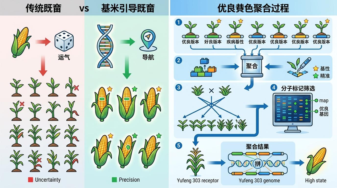 他们用的方法叫**有利等位基因聚合**,简单说就是把8个基因的优良版本,通过杂交和分子标记筛选,精准「拼」到豫丰303的基因组里。这和传统杂交育种完全不同:传统育种是把两个玉米杂交后,靠运气看后代有没有好性状,而基因组学指导的育种,就像拿着基因「地图」精准导航,能准确知道后代有没有带上需要的优良基因。