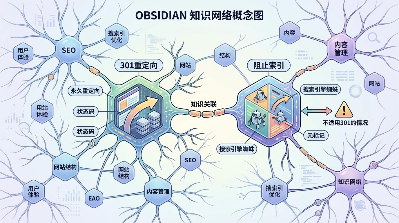 和普通的Word文档比,Obsidian的优势在于“链接”——每个知识点都能和其他相关内容连起来。比如你看“301重定向”的时候,能直接跳转到“阻止索引”的文档,了解什么时候不能用301。这种“知识网络”,才是能真正帮你解决问题的知识库,而不是一堆零散的文字。