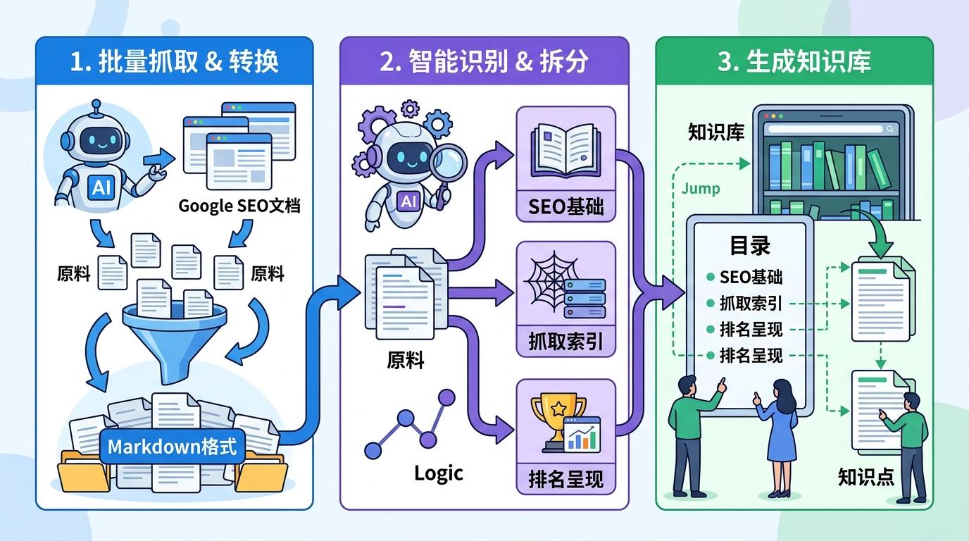 你可以把AI知识蒸馏想象成熬汤——Google的官方文档是满满一筐新鲜食材,AI就是那个懂火候的厨师:先把所有食材(网页内容)捞出来清洗干净(去重、格式转换),再按照营养成分(SEO模块)分类切块,最后用慢火熬出最浓的汤汁(结构化知识库)。