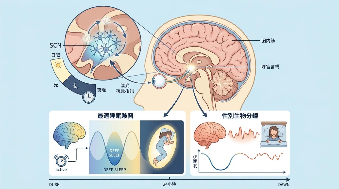 我们的睡眠有严格的「生物时间窗」,由下丘脑的视交叉上核——也就是我们常说的生物钟——调控。它就像一个精准的闹钟,只在特定时间段允许深度睡眠启动。如果你的生物钟还停在「白天模式」,就算躺够8小时,也只是浅眠,根本达不到修复效果。