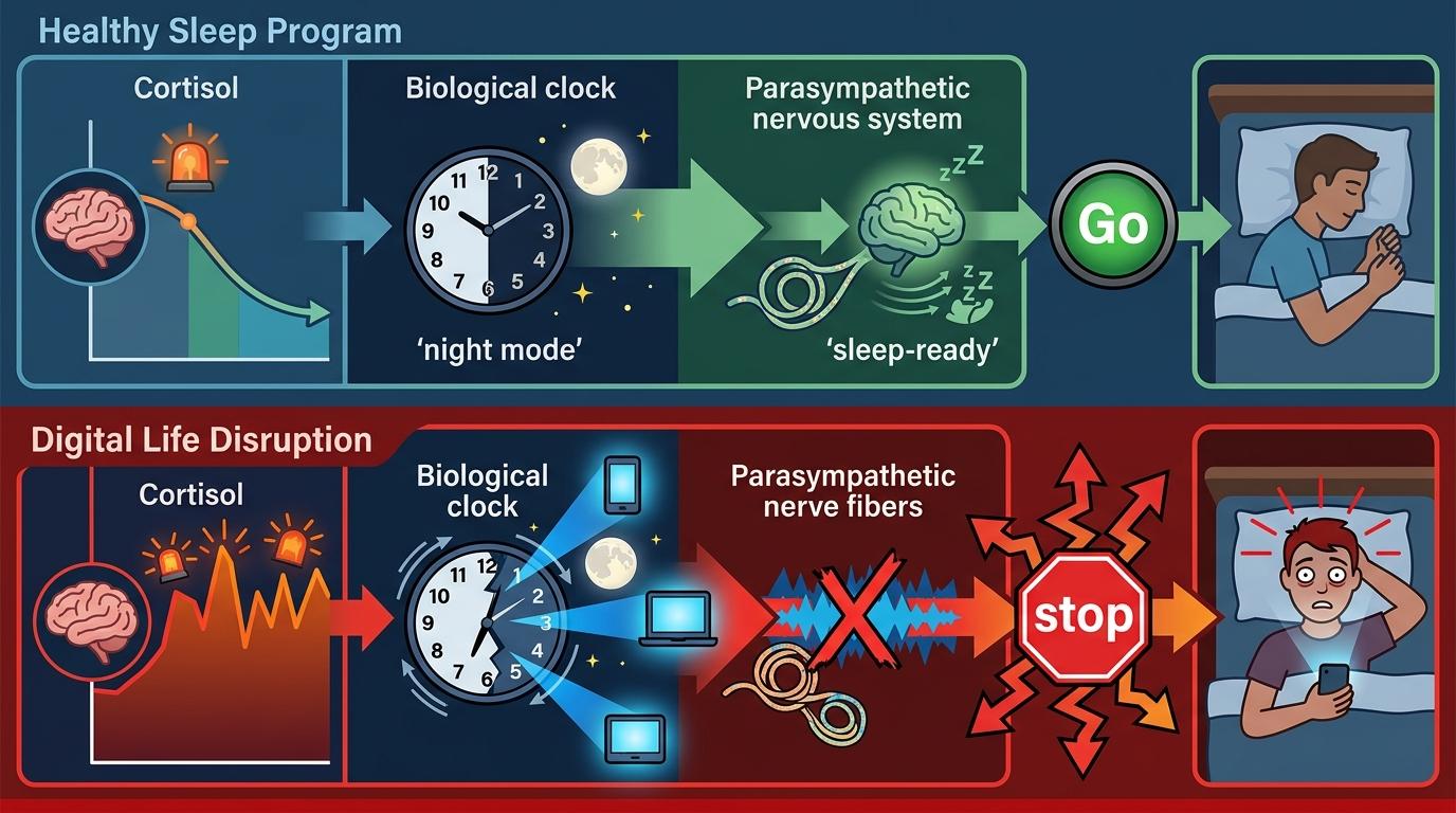 我们的身体自带一套「休息启动程序」:天黑后皮质醇(身体的警觉激素)慢慢下降,副交感神经接手主导,生物钟彻底切换到夜间模式——这是大脑发出的「可以睡了」的绿灯。但数字生活正在把这套程序搅得一团乱。